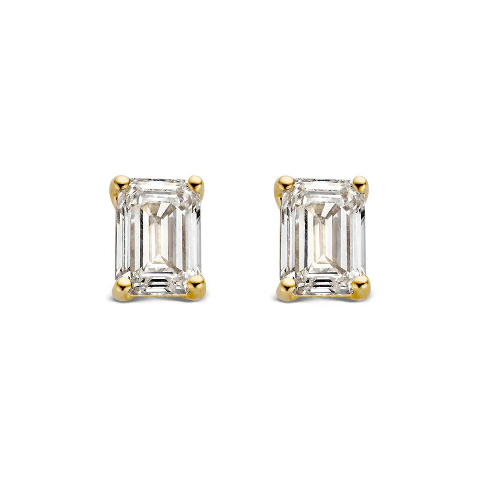 De emerald diamanten zijn de eyecatchers van de prachtige Nora serie. De schitterende langwerpige diamanten tonen een bijzondere diepte. Dit wordt ook wel het hall of mirror effect genoemd. Emerald geslepen diamanten tonen groot en onalledaags. Deze solitair oorstekers zijn gezet met 2 x 0,25 crt. en hebben dus een totaal gewicht van 0,50 crt. Kies zelf de gewenste steengrootte van jouw diamant. De Nora oorbellen zijn in verschillende maten en goudkleuren beschikbaar.