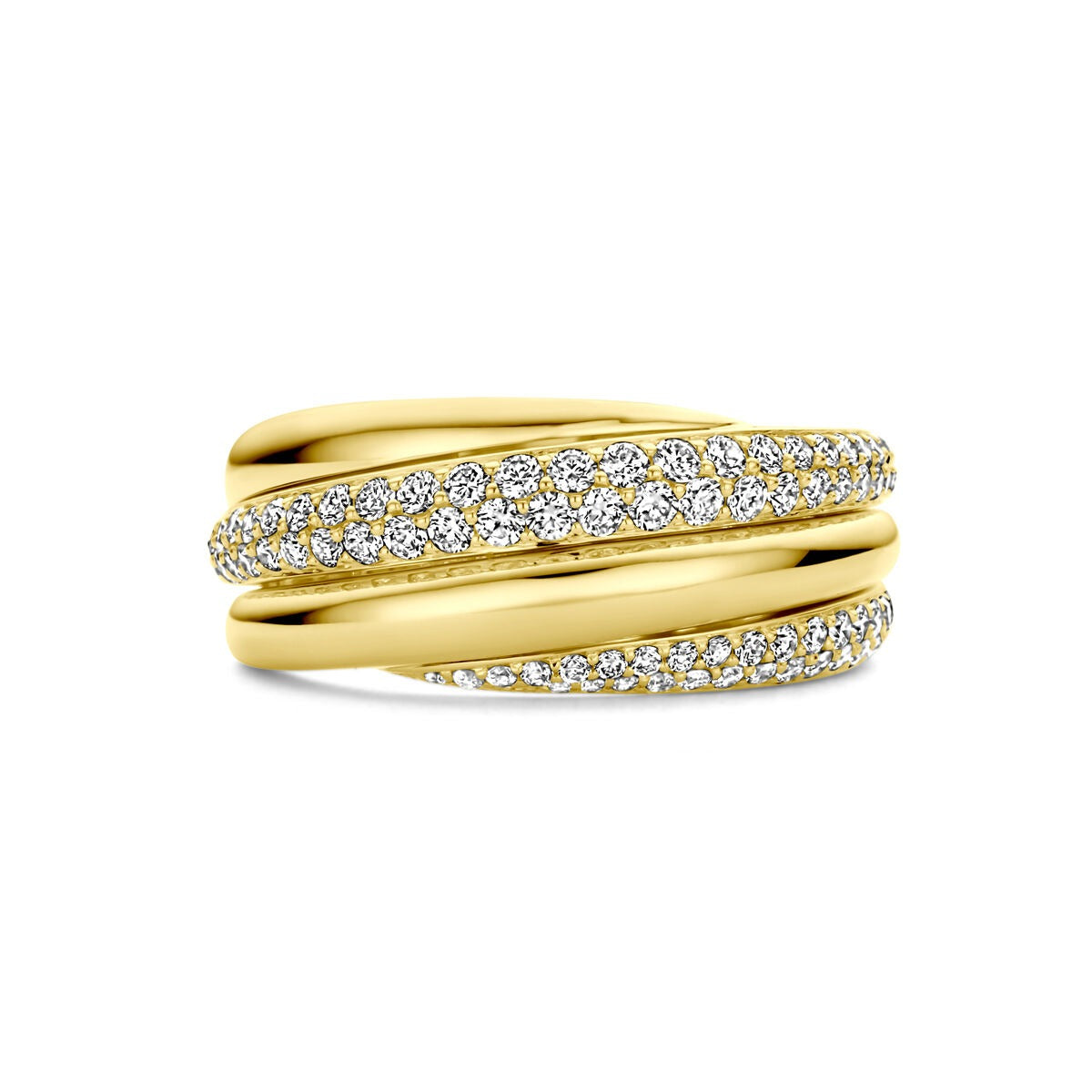 De rijzetting zorgt voor een strakke, moderne lijn vol schittering, terwijl het bicolor ontwerp een subtiel spel van contrast biedt. Dit maakt de ring zowel stijlvol als opvallend – een perfecte keuze voor wie durft te schitteren.