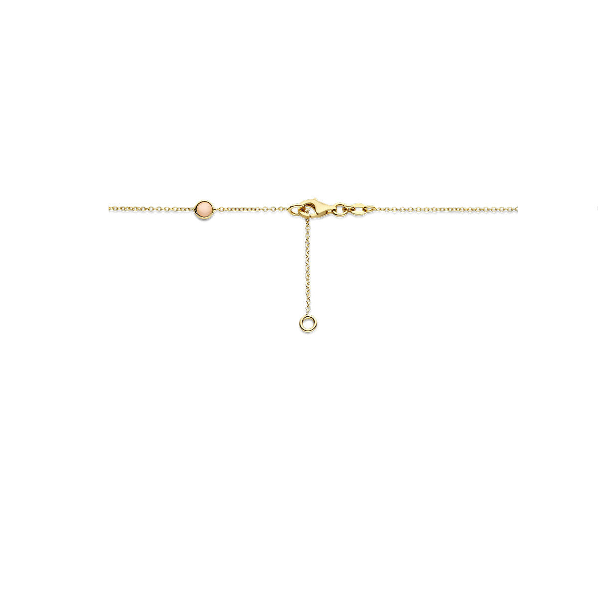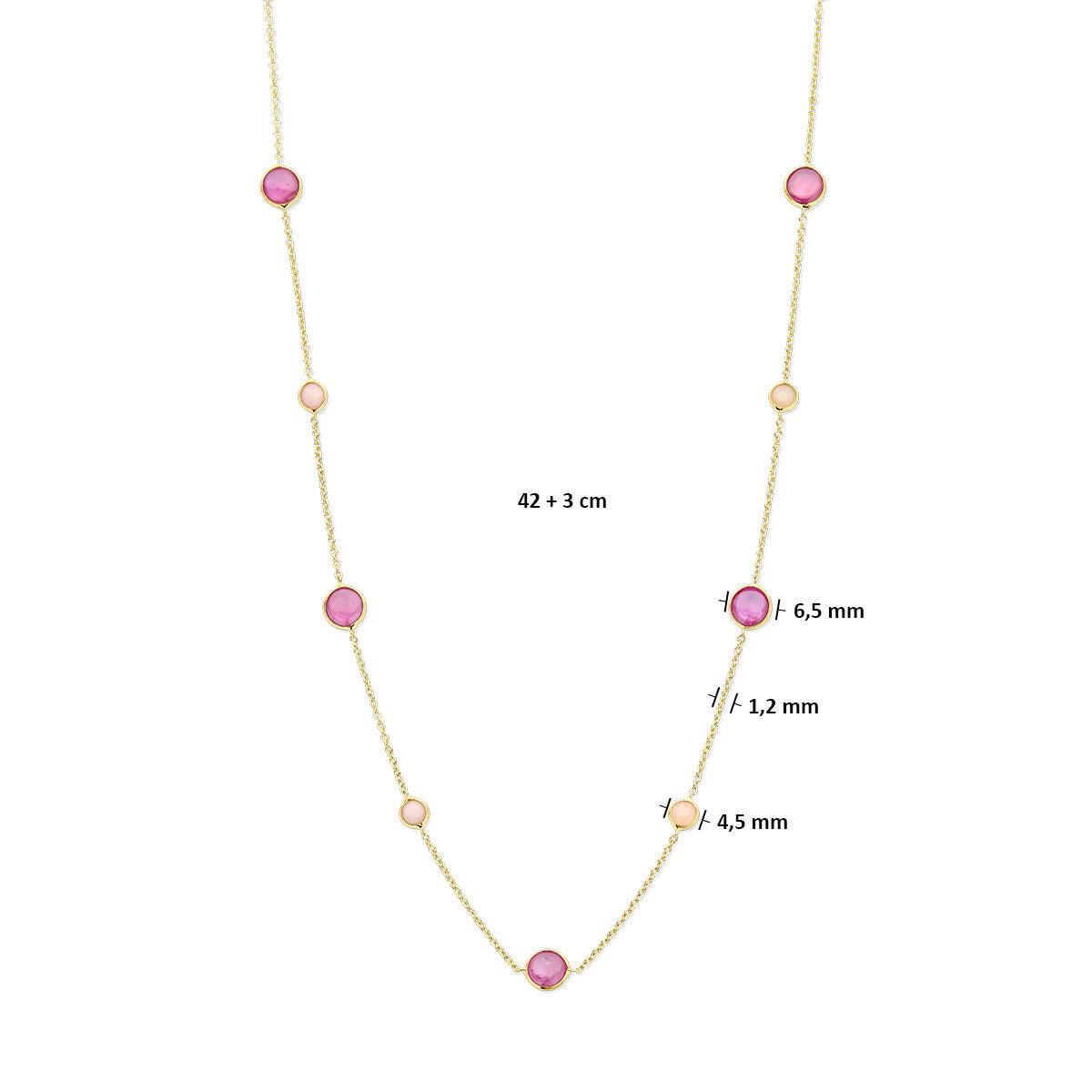14k Geelgouden collier uitgevoerd met roze robijn en roze opaal. De draaglengtes van de collier zijn 42 en 45cm. De breedtes van de stenen met zetkast is 6.5 en 4.5mm.