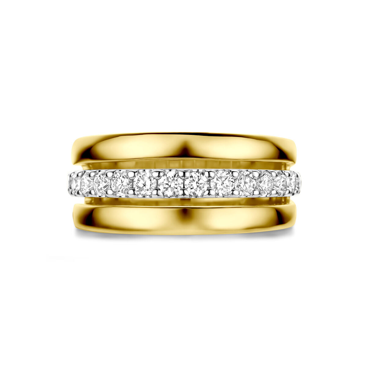 Deze 14 karaat bicolor ring is een schitterende samensmelting van elegantie en vakmanschap. Het contrast tussen het warme geelgoud en het stralende witgoud benadrukt het moderne, doch tijdloze karakter van deze ring. Met een royale breedte van 9 mm vormt het ontwerp een krachtig statement aan de hand.