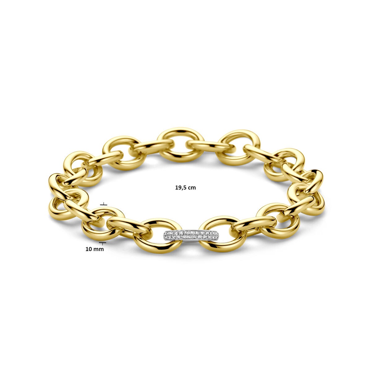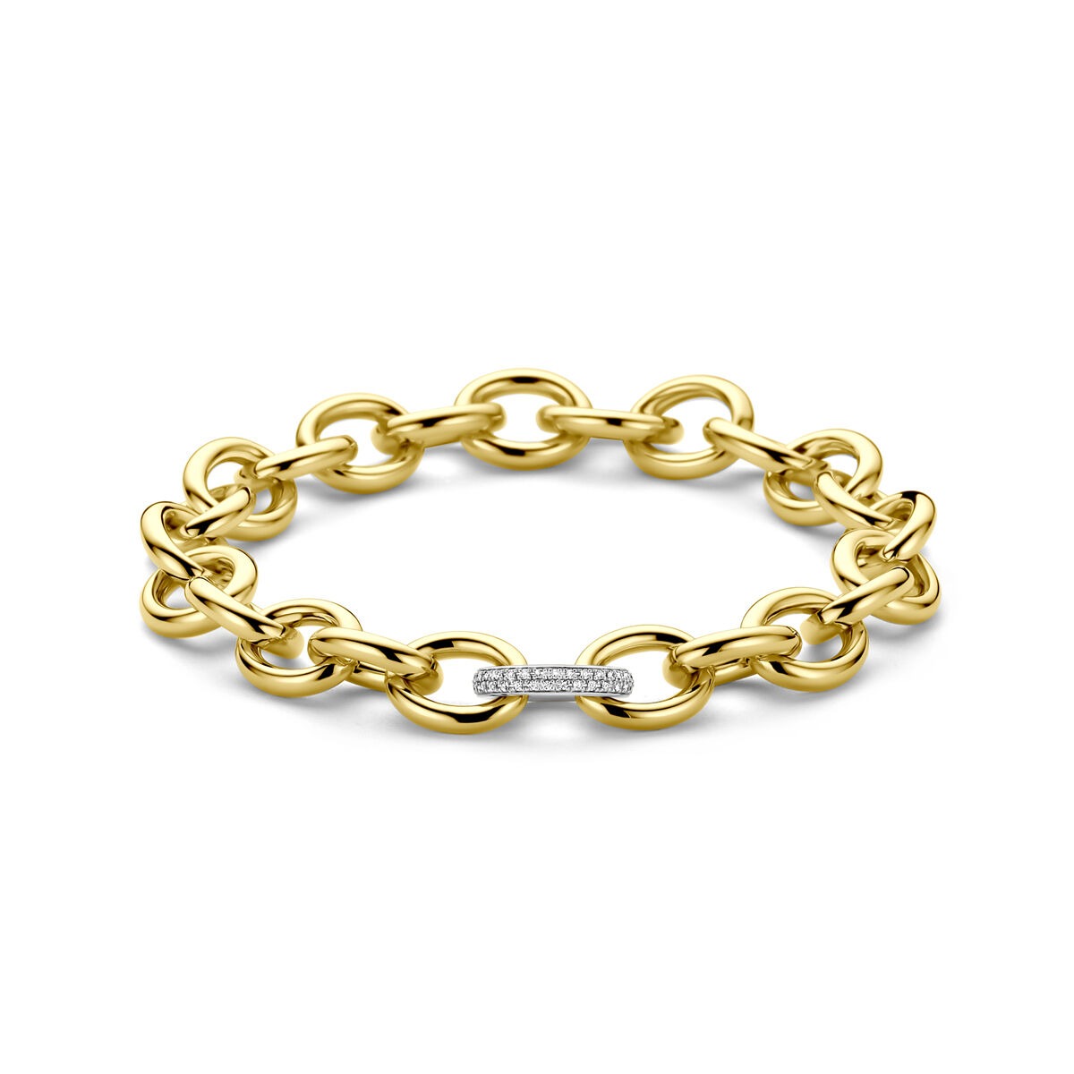 Deze exclusieve armband is vervaardigd van 14 karaat bicolor goud, waarin warm geelgoud en verfijnd witgoud op elegante wijze samenkomen. Het ontwerp wordt gekenmerkt door een opvallende fantasie schakel, die de armband een luxe en eigentijds karakter geeft. De pavé gezette briljant geslepen diamanten zorgen voor een subtiele, maar rijke fonkeling en versterken de verfijnde uitstraling. Het totale diamantgewicht van 0,17 karaat onderstreept het hoogwaardige vakmanschap van dit sieraad.