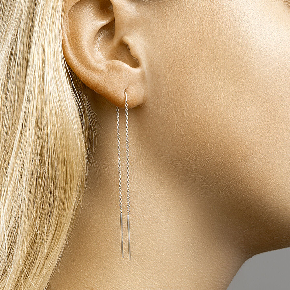 Deze zilveren doortrekoorbellen zijn het toonbeeld van minimalistische elegantie. Gemaakt van gerhodineerd 925 zilver, blijven ze langdurig glanzend en goed beschermd tegen krassen en verkleuring. Het slanke staafvormige ontwerp van slechts 1 mm breed en 7,5 cm lang zorgt voor een verfijnd, luchtig silhouet dat moeiteloos mee beweegt met elke beweging.