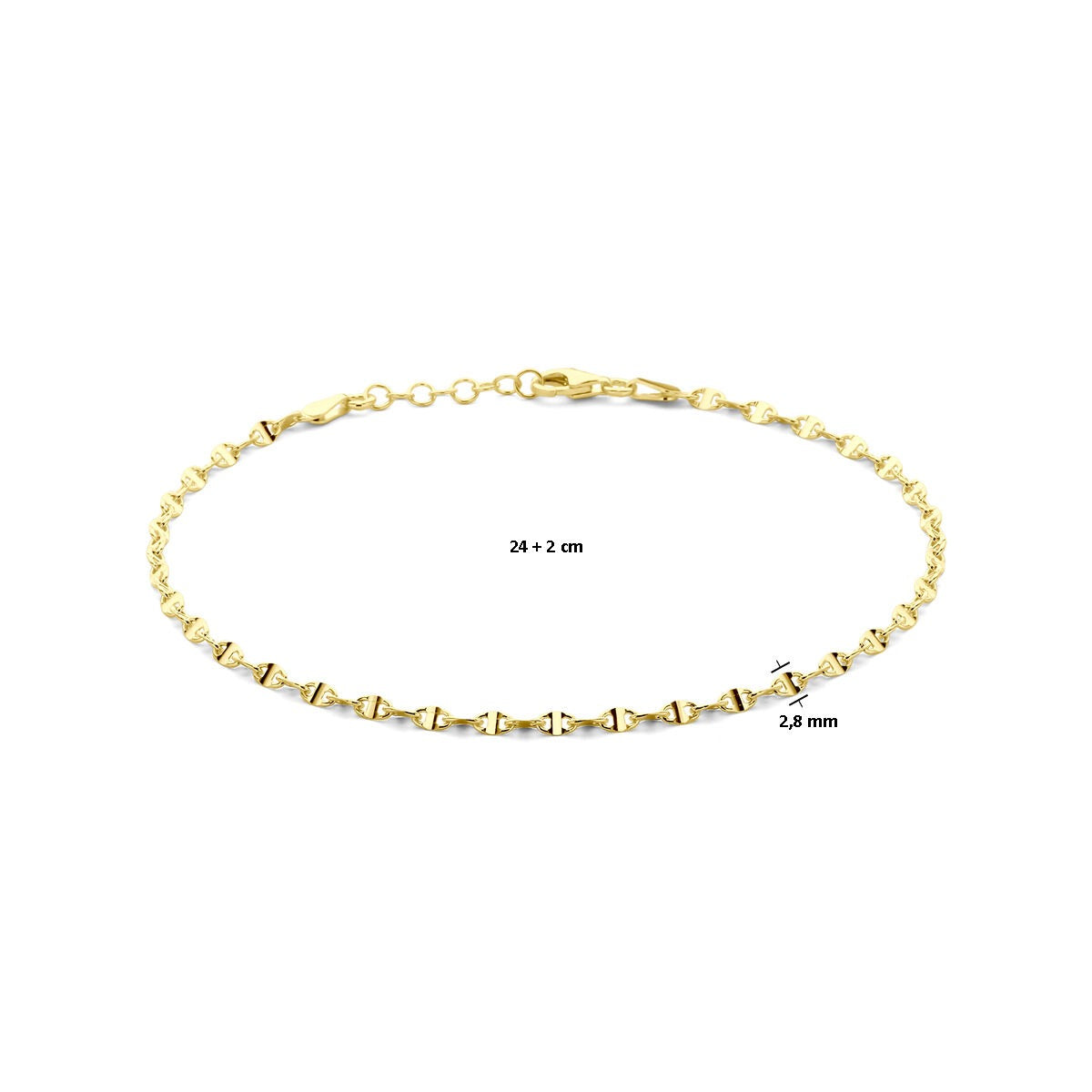 De draaglengte van 24 cm is verstelbaar tot 26 cm dankzij het praktische verlengkettinkje, waardoor het enkelbandje altijd mooi aansluit. De stevige karabijnsluiting zorgt voor een veilige en comfortabele pasvorm.