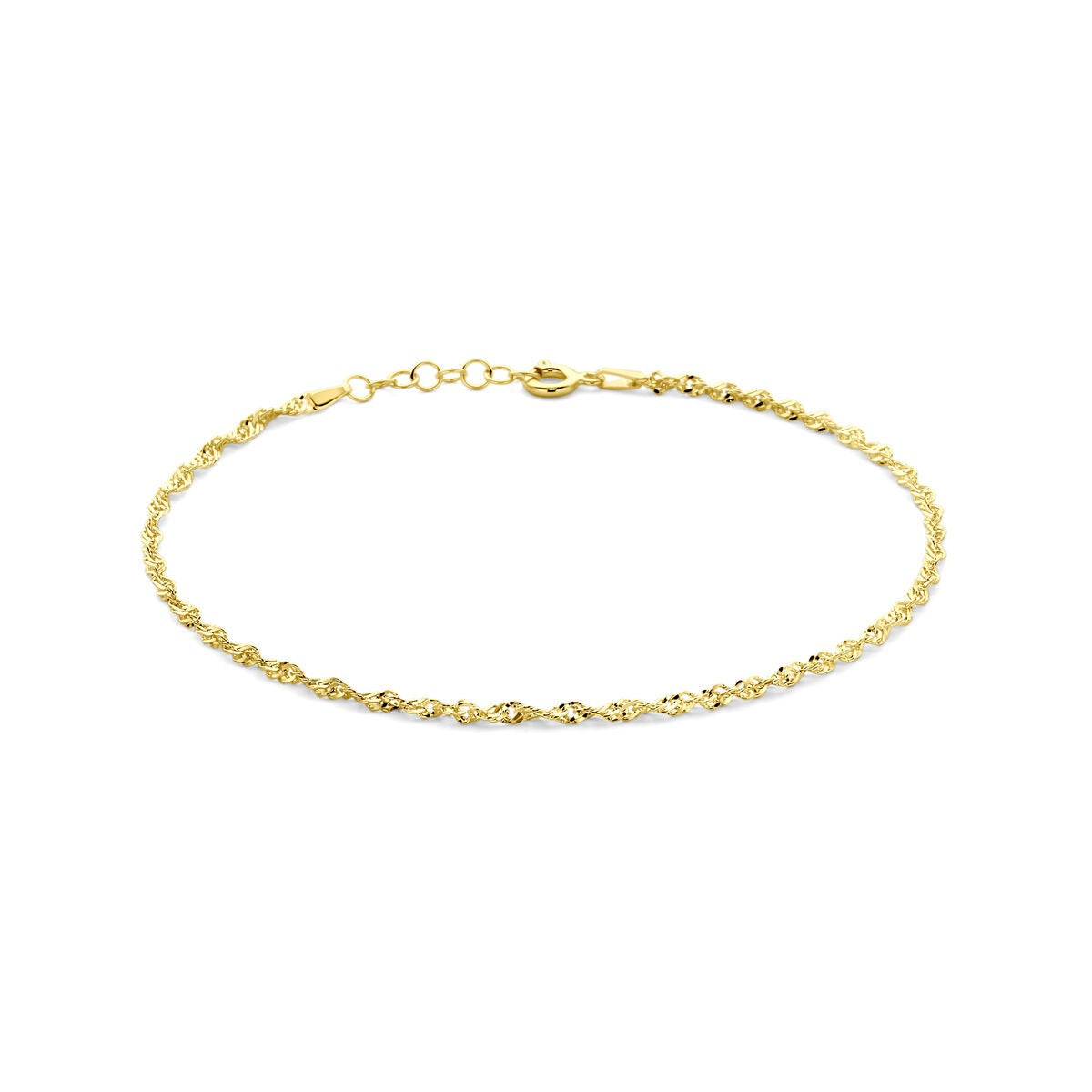 Dit elegante enkelbandje van geelgoud verguld 925 zilver is een verfijnd accessoire met zomerse allure. De speels gedraaide Singapore schakel van 2,25 mm breed zorgt voor een subtiele schittering bij elke beweging, terwijl de goudkleurige afwerking een warme en luxe uitstraling biedt.