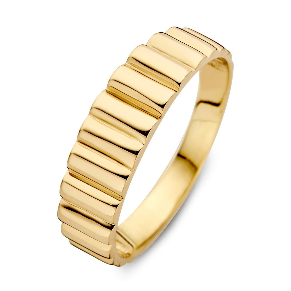 Geelgouden ring met strak ribbeltjes patroon. De perfecte toevoeging aan jouw ringstack!