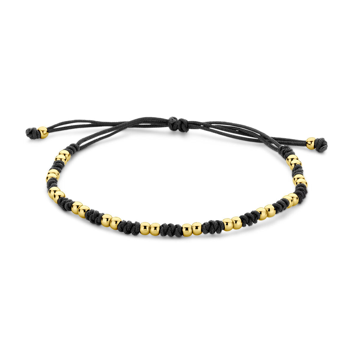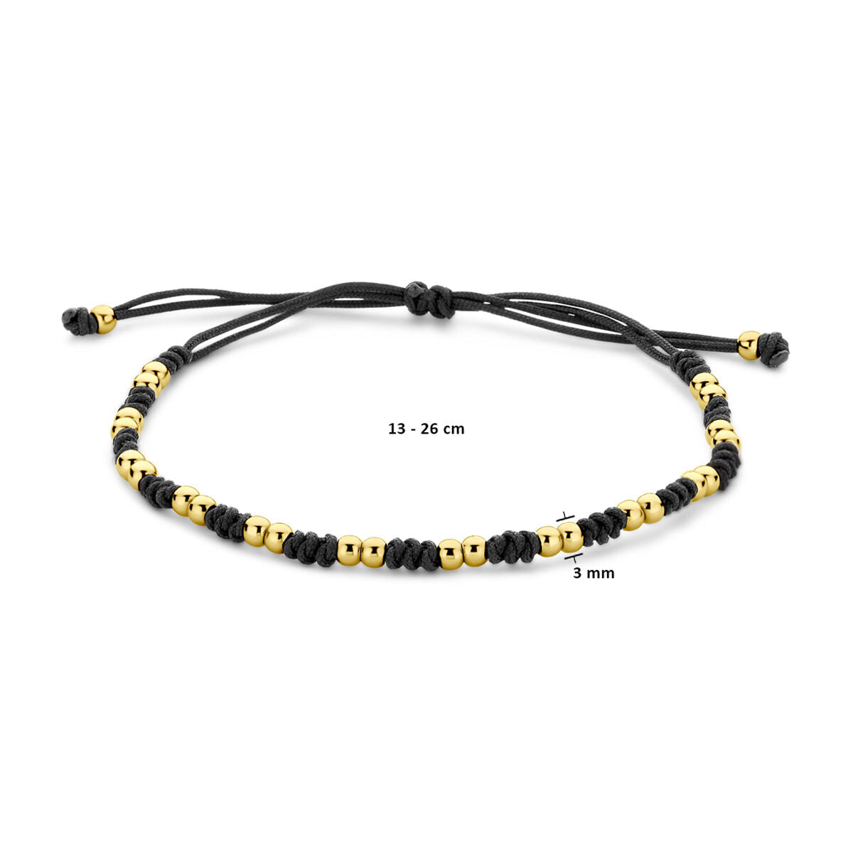 Zwart gevlochten armband uitgevoerd met 14k geelgouden bolletjes. De armband heeft een draaglengtes van 12-24cm.