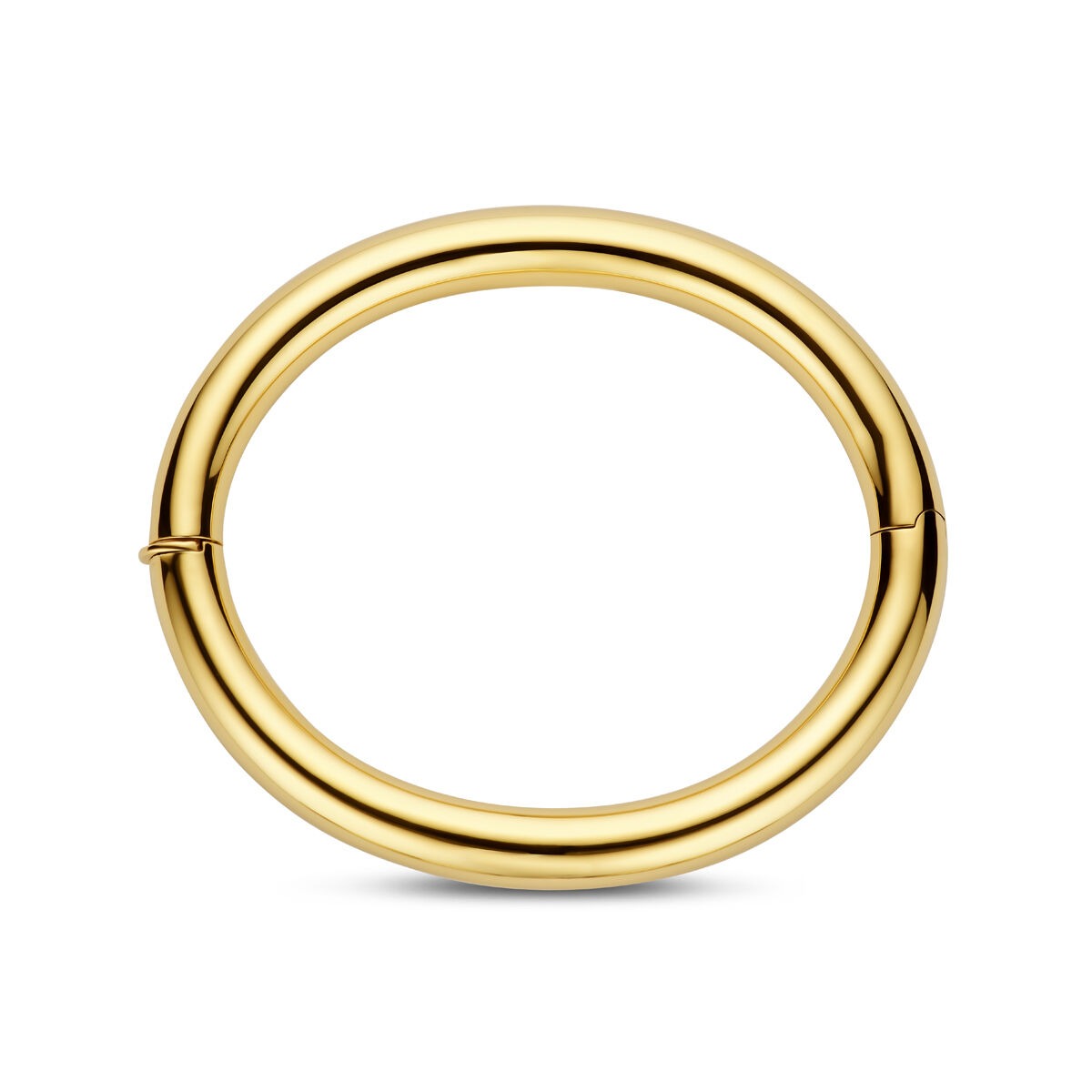 Dankzij de solide scharniersluiting is de armband eenvoudig om en af te doen, terwijl de stevige constructie garant staat voor jarenlang draagplezier. Deze bangle is perfect als solostuk, maar ook prachtig te combineren met andere gouden bangle armbanden voor een gelaagd effect.
