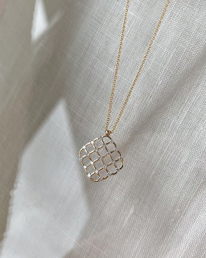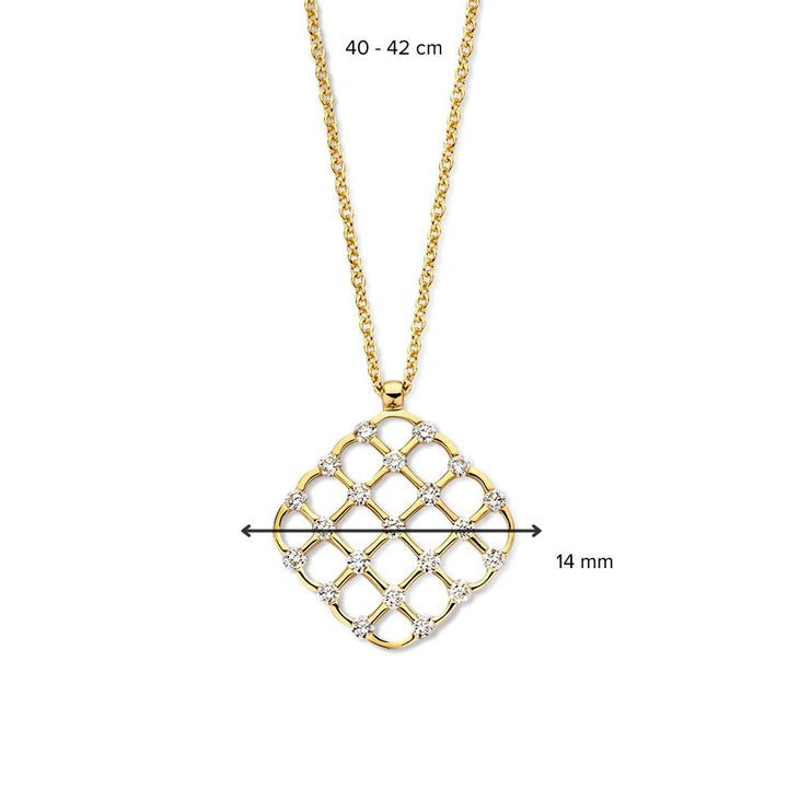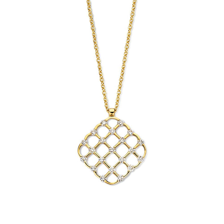Geelgouden collier met hanger in bijzonder design, gezet met fonkelende diamanten.