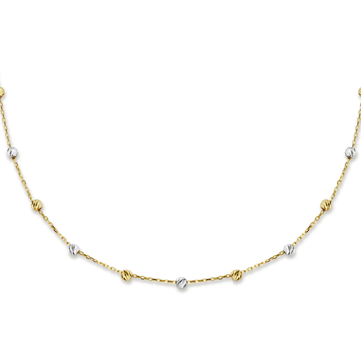 14k Bi-color wit- en geelgouden collier met een schakelbreedte van 1mm. Uitgevoerd met gediamanteerde bolletjes van 3mm. Het collier heeft draaglengtes van 40, 42 en 44cm.