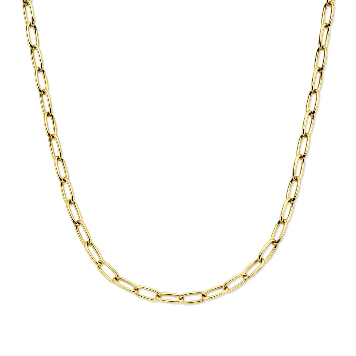 Dit 14k geelgouden dames collier is een krachtige combinatie van eigentijds design en klassieke luxe. De opvallende schakels van 7 mm breed – een verfijnde mix van ronde en rechthoekige draadvormen – geven het collier een open en luchtige uitstraling met een moderne twist. De warme glans van het massief geelgoud zorgt voor een elegante, tijdloze finish.