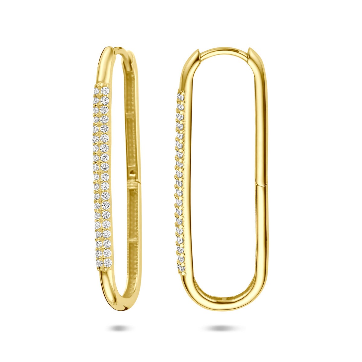 Deze 14 karaat geelgouden klapoorringen zijn een elegante blikvanger met een schitterende afwerking. De oorringen hebben een lengte van 34 mm en een slanke breedte van 2.5 mm, wat zorgt voor een verfijnde uitstraling met een modern silhouet. De fonkelende briljant geslepen zirkonia’s zijn pavé gezet in een stijlvolle rijzetting, waardoor de oorringen bij elke beweging subtiel het licht vangen.