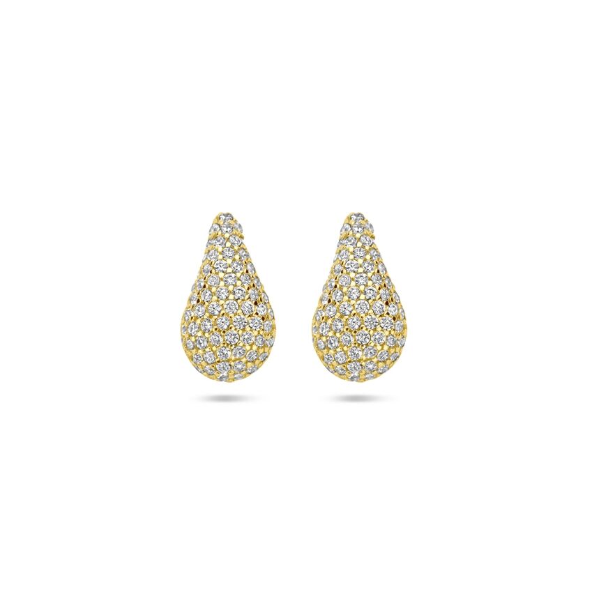 14k Geelgouden oorknoppen uitgevoerd in de vorm van een druppel met zirkonia. De oorknoppen hebben een afmeting van 13,5x7,5mm.