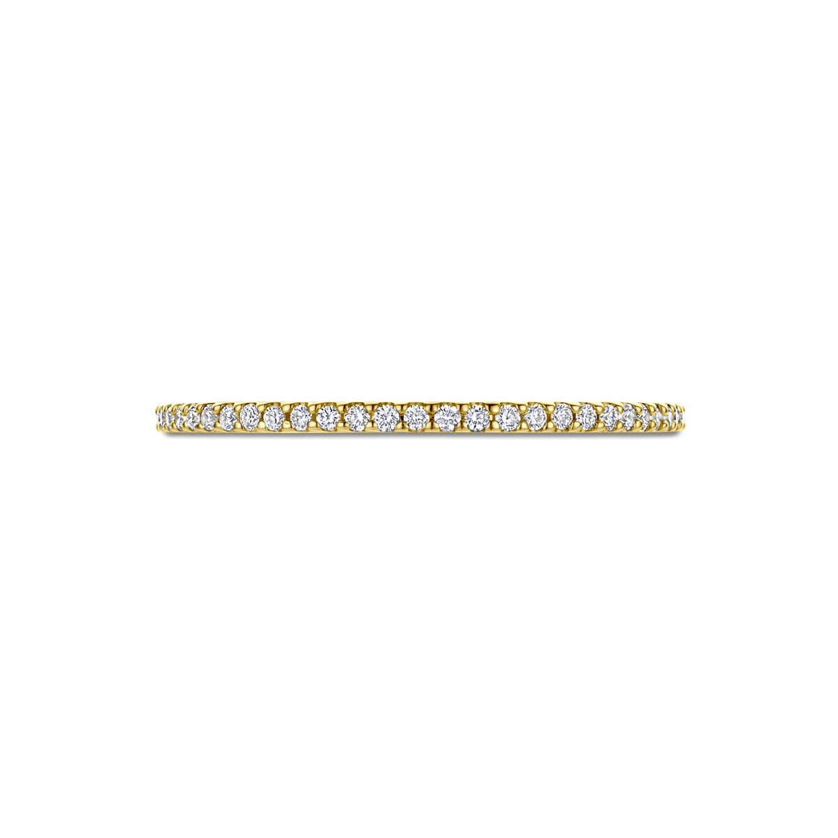 Deze 14 karaat geelgouden ring is een verfijnd sieraad met een subtiele, doch schitterende uitstraling. De smalle band van slechts 1 mm breed is uitgevoerd met een elegante rijzetting van briljant geslepen diamanten, met een totaalgewicht van 0.11 ct en een transparante SI1-kwaliteit.