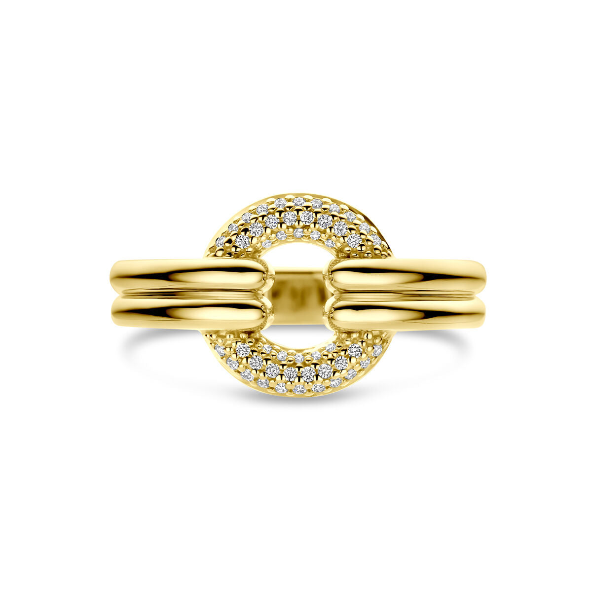 Het warme geelgoud contrasteert prachtig met de transparante diamantjes, wat de ring een elegante gloed en rijke uitstraling geeft. Dit statement piece is perfect voor vrouwen die een uitgesproken stijl weten te waarderen – zowel als opvallend dagelijks sieraad als bij bijzondere gelegenheden.