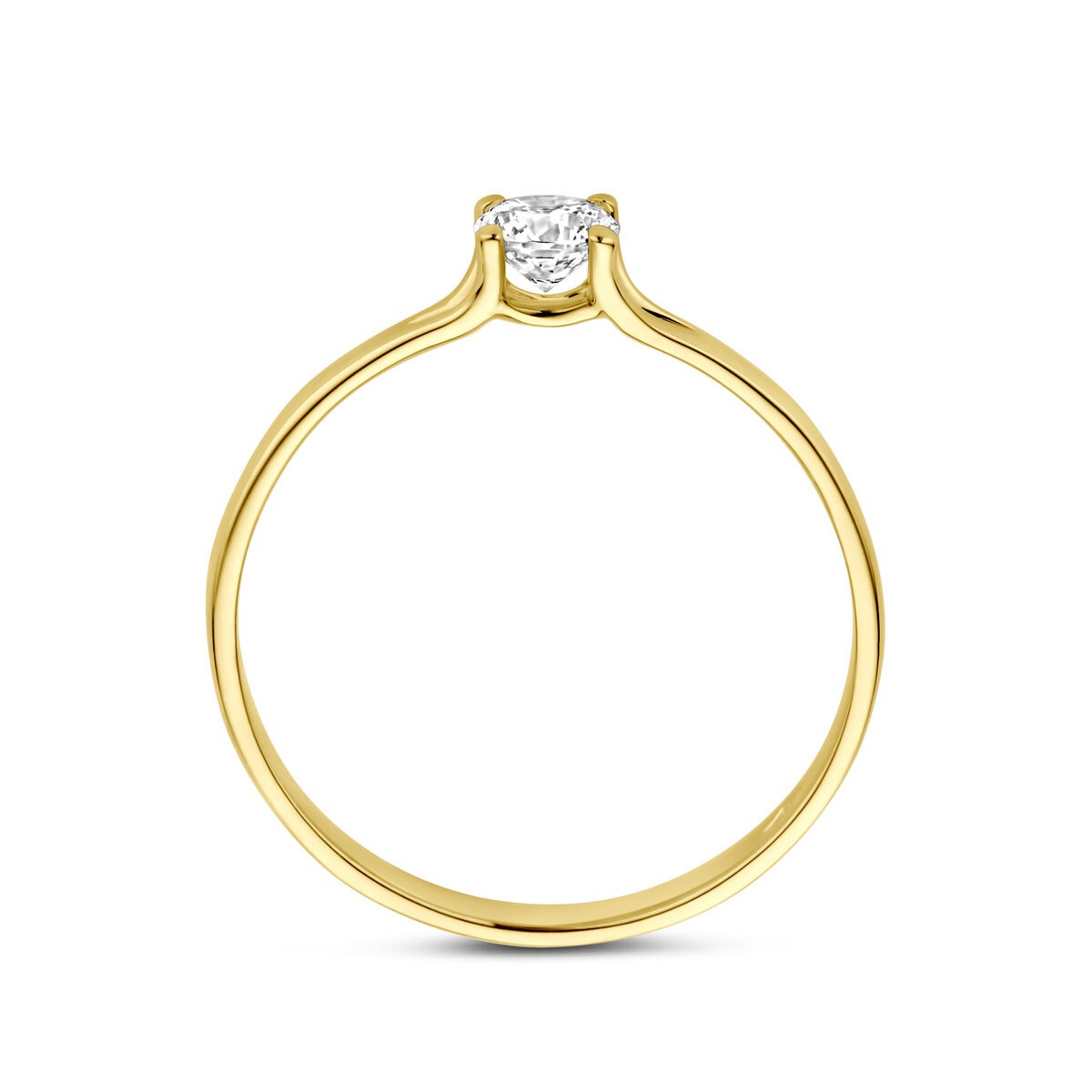 Deze 14 karaat gouden damesring is een prachtig voorbeeld van verfijnde eenvoud met maximale impact. De solitaire zirkonia van 4 mm is briljant geslepen en schittert subtiel in een klassieke chatonzetting met vier pootjes. Deze zetwijze laat veel licht toe, waardoor de transparante steen een heldere, levendige fonkeling krijgt.