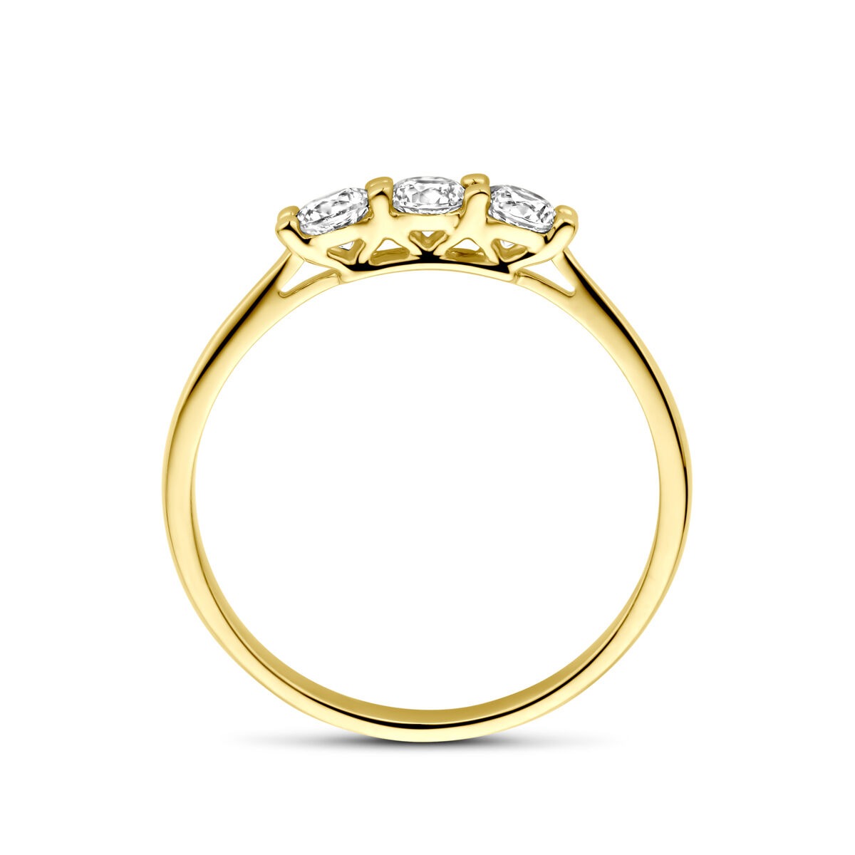 Een perfecte balans tussen finesse en schittering: deze 14 karaat gouden damesring is ontworpen om op te vallen, zonder te overheersen. De ring is bezet met briljantgeslepen zirkonia’s van 3,5 mm in een verfijnde chatonzetting, waardoor elke steen vrij ligt en maximaal licht opvangt. Dit zorgt voor een betoverende fonkeling die bij elke beweging tot leven komt.
