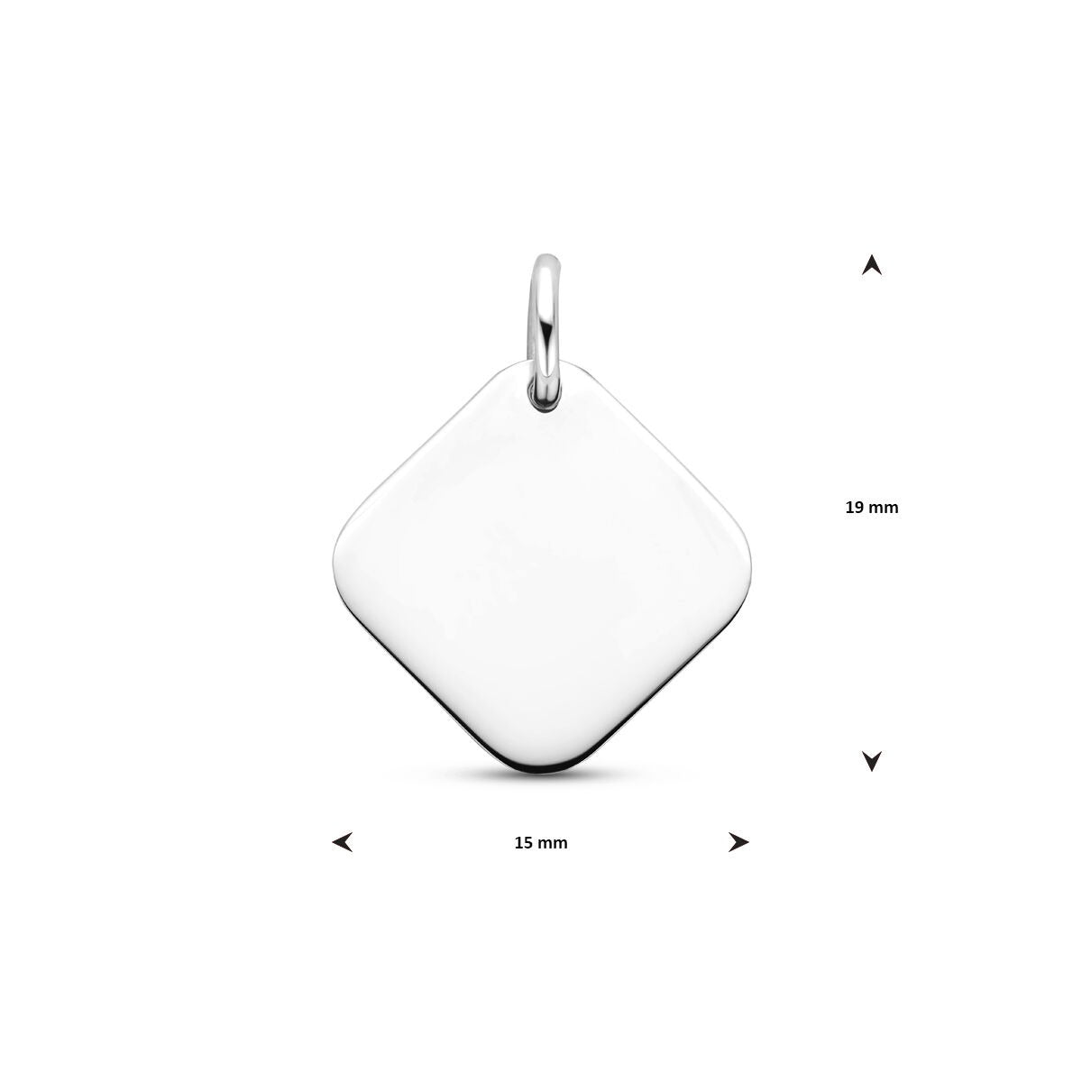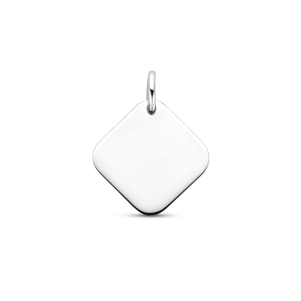 Deze stijlvolle graveerhanger is vervaardigd van 925 sterling zilver en afgewerkt met een beschermende rodiumlaag, die zorgt voor een heldere zilverkleurige glans en langdurige bescherming tegen verkleuring. Het vierkante ontwerp met een afmeting van circa 15 bij 15 millimeter geeft de hanger een moderne en krachtige uitstraling, terwijl de gladde afwerking zorgt voor een tijdloos en elegant geheel.