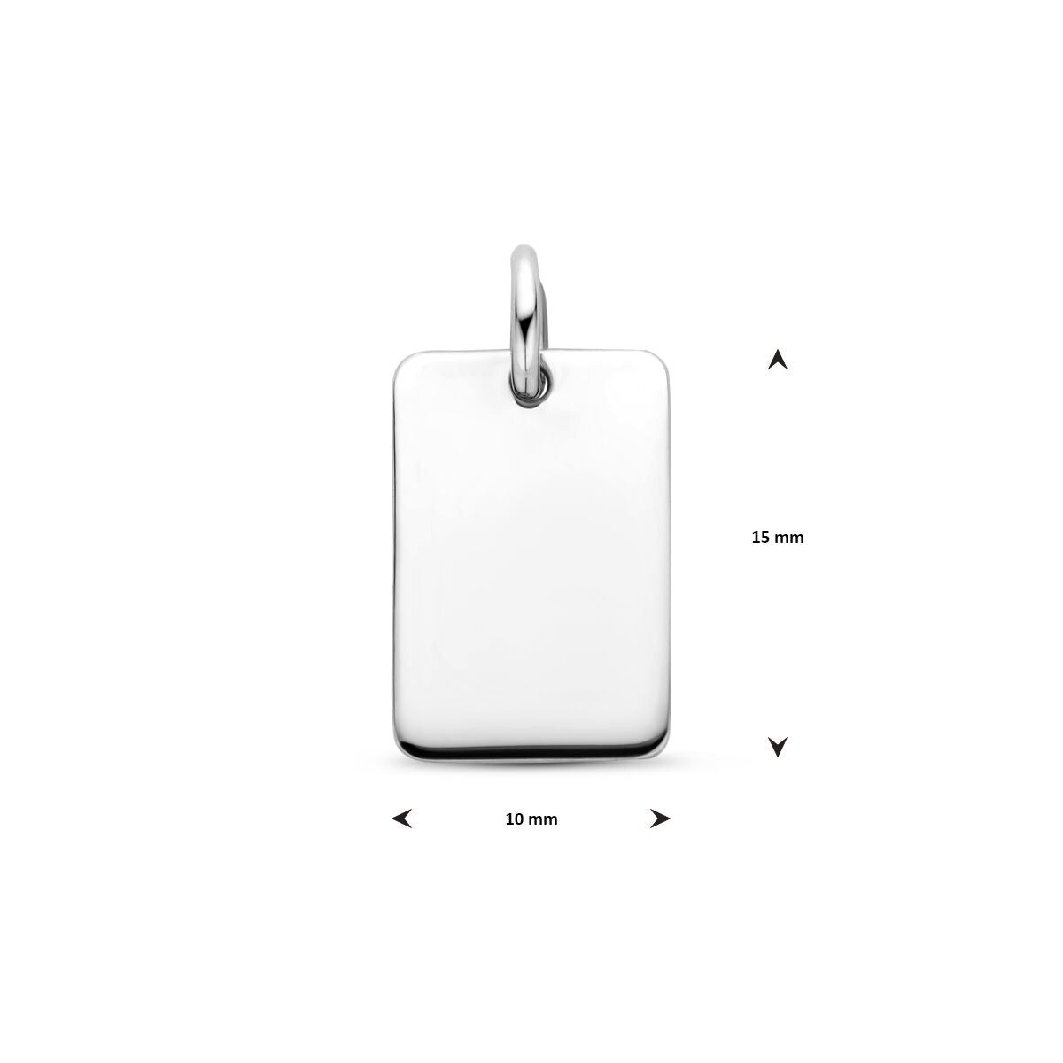 Deze elegante graveerhanger is vervaardigd van 925 sterling zilver en afgewerkt met een beschermende rodiumlaag, waardoor het sieraad een heldere zilverkleurige glans heeft en langdurig mooi blijft. Het rechthoekige graveerplaatje vormt het hart van het ontwerp en biedt ruimte voor een persoonlijke gravure, zoals een naam, initialen, datum of een korte betekenisvolle boodschap. Hierdoor krijgt de hanger een uniek en emotioneel karakter.