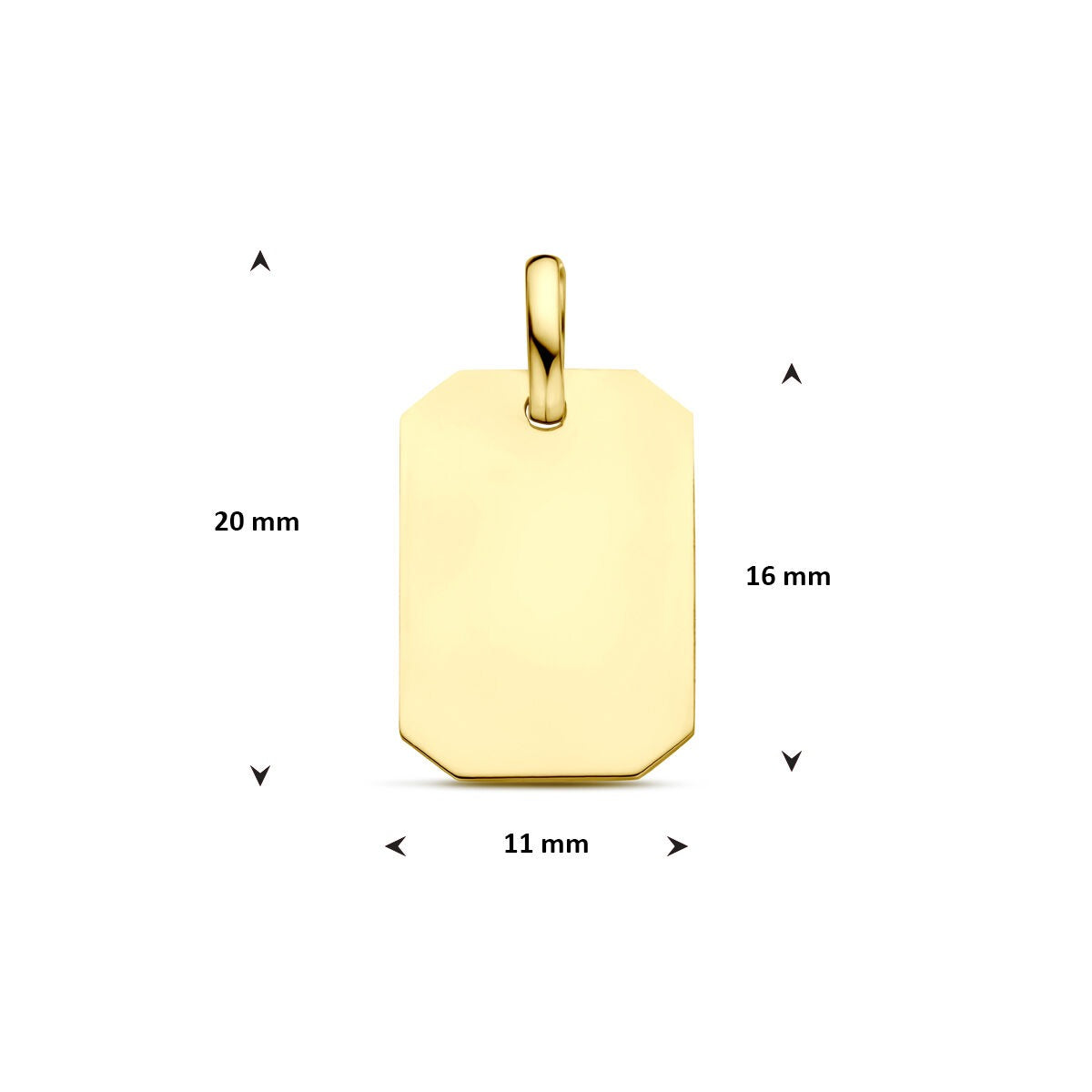 Deze 9 karaat geelgouden graveerhanger is een tijdloos sieraad met een persoonlijke touch. Met een totale hoogte van 20 mm en een breedte van 11 mm biedt het glanzend gepolijste oppervlak ruimte voor een gravure die het sieraad uniek en betekenisvol maakt – denk aan initialen, een naam of een speciale datum.