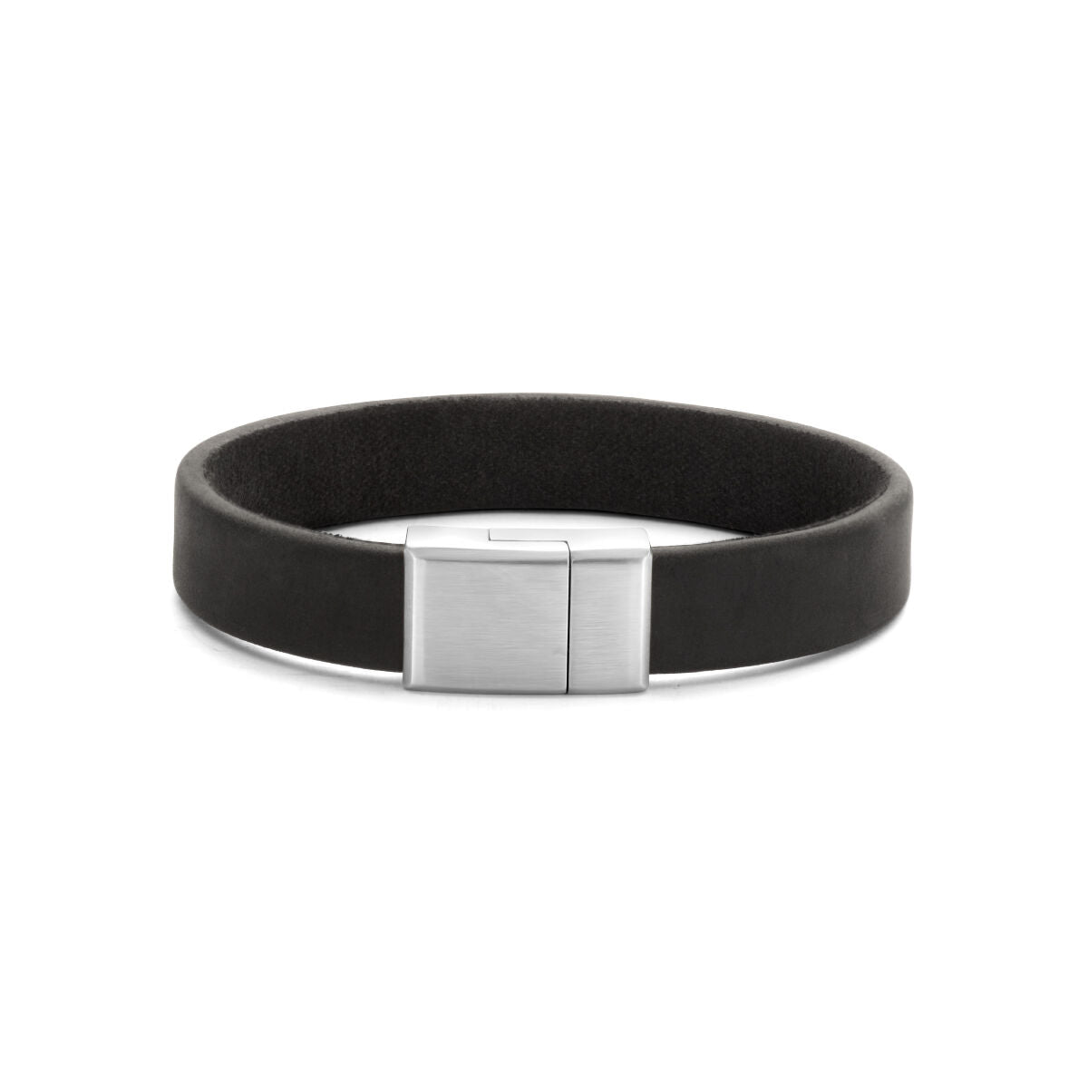 Zwart leren armband uitgevoerd met een stalen magneetsluiting. De armband heeft een breedte van 12mm.