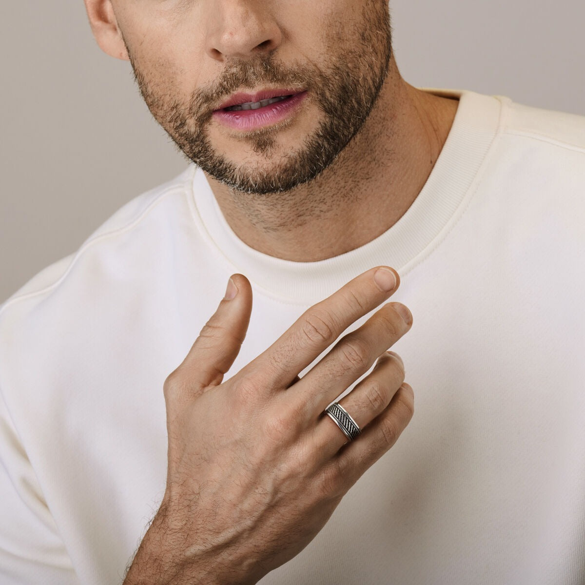 Het robuuste ontwerp straalt vakmanschap en individualiteit uit, ideaal voor de man die waarde hecht aan authenticiteit en stijl. Deze ring laat zich moeiteloos combineren met zowel casual als formele outfits en vormt een blijvende toevoeging aan elke sieradencollectie.