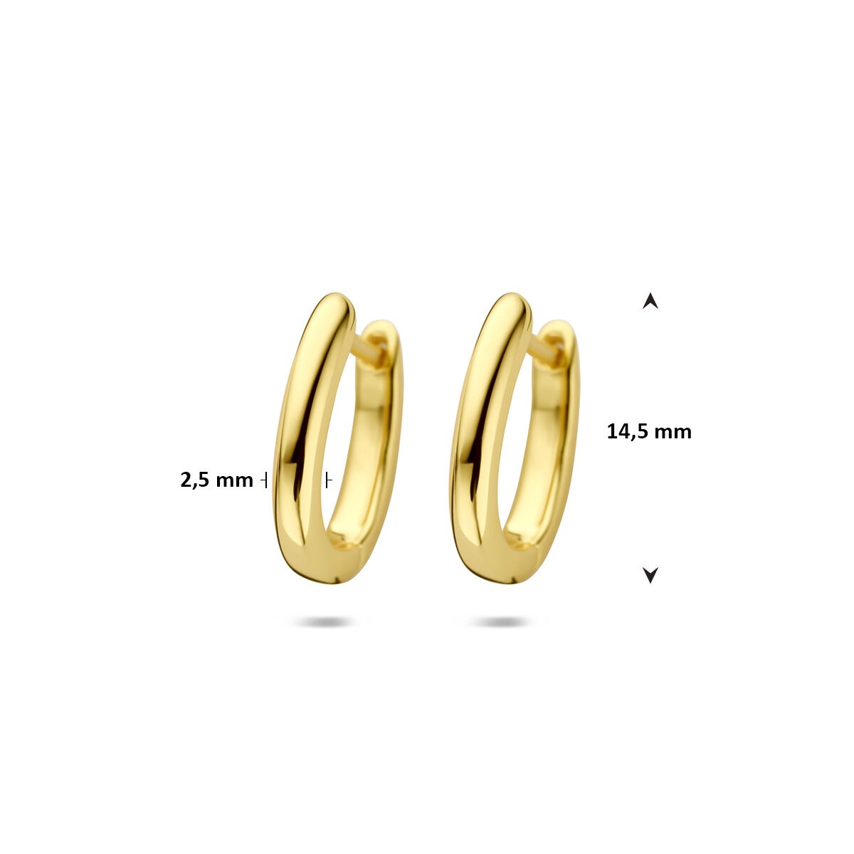 De warme goudkleurige plating geeft de oorringen een klassieke uitstraling met een moderne twist. Dankzij de praktische scharniersluiting zijn ze eenvoudig aan te brengen en blijven ze comfortabel en stevig zitten. Let op: de vergulde afwerking kan na verloop van tijd slijten bij intensief gebruik; hierop wordt geen garantie gegeven.
