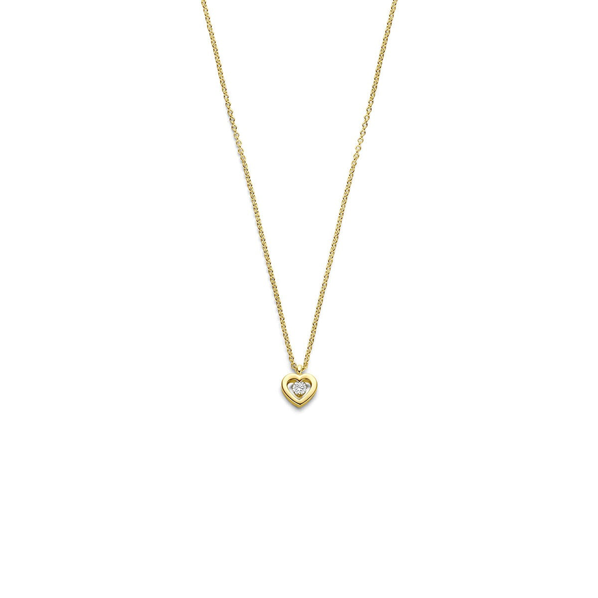 Een symbool van liefde, verfijnd in elke lijn – dit 14k geelgouden collier is uitgevoerd met een hartvormig element waarin een briljant geslepen diamant schittert. De subtiele steen van 0,05 ct (SI1-kwaliteit) is gezet in een elegante chatonzetting en vangt het licht op delicate wijze. Met een afmeting van 6 x 5,5 mm vormt het hartje een intiem, betekenisvol detail op de huid.