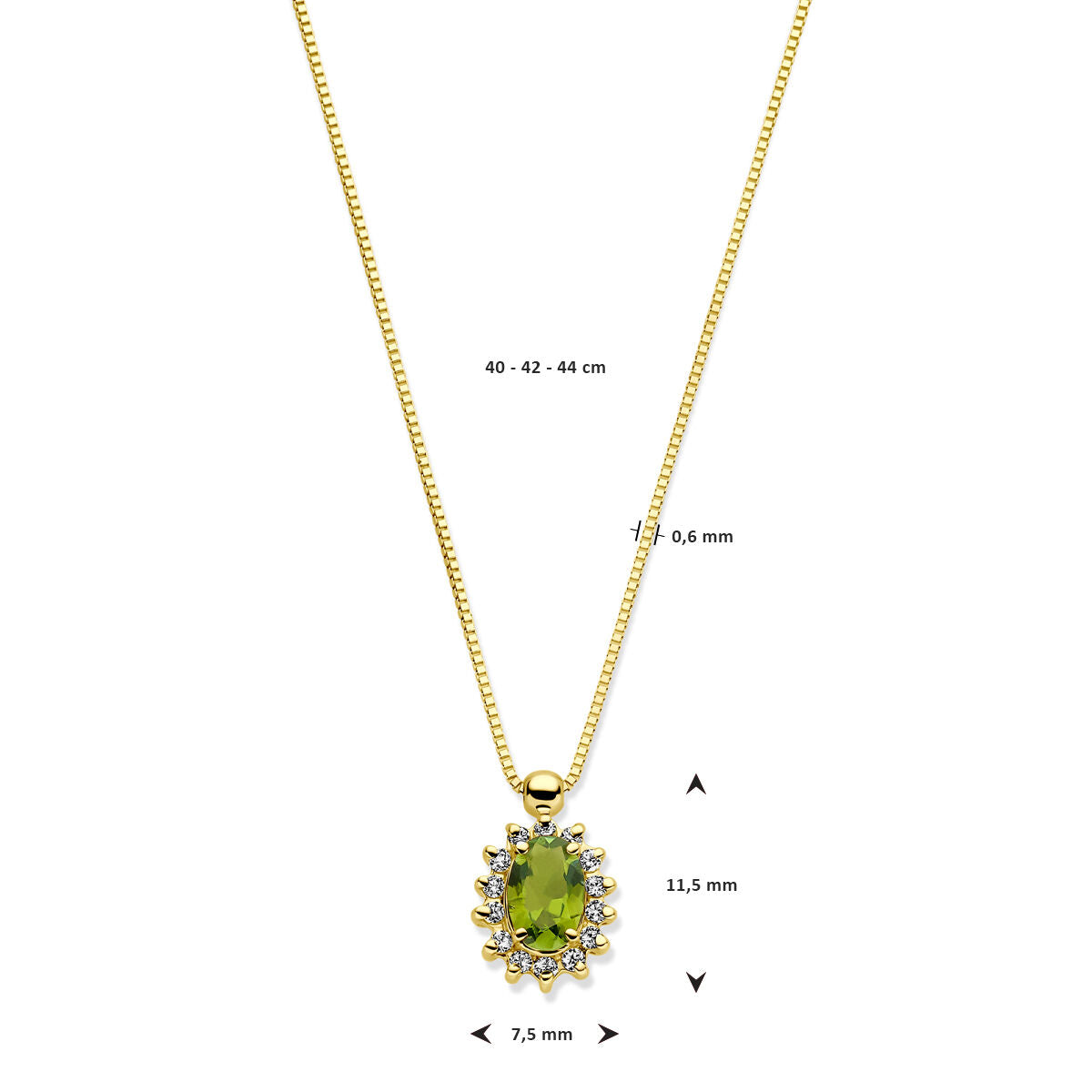 De hanger meet 11.5 x 7.5 mm en is gezet in een klassieke 4-poots chatonzetting, waardoor de stenen optimaal tot hun recht komen. De fijne Venetiaanse schakel van slechts 0.6 mm breed draagt elegant en subtiel om de hals, met verstelbare lengtes van 40, 42 en 44 cm – ideaal om aan te passen op verschillende halslijnen.