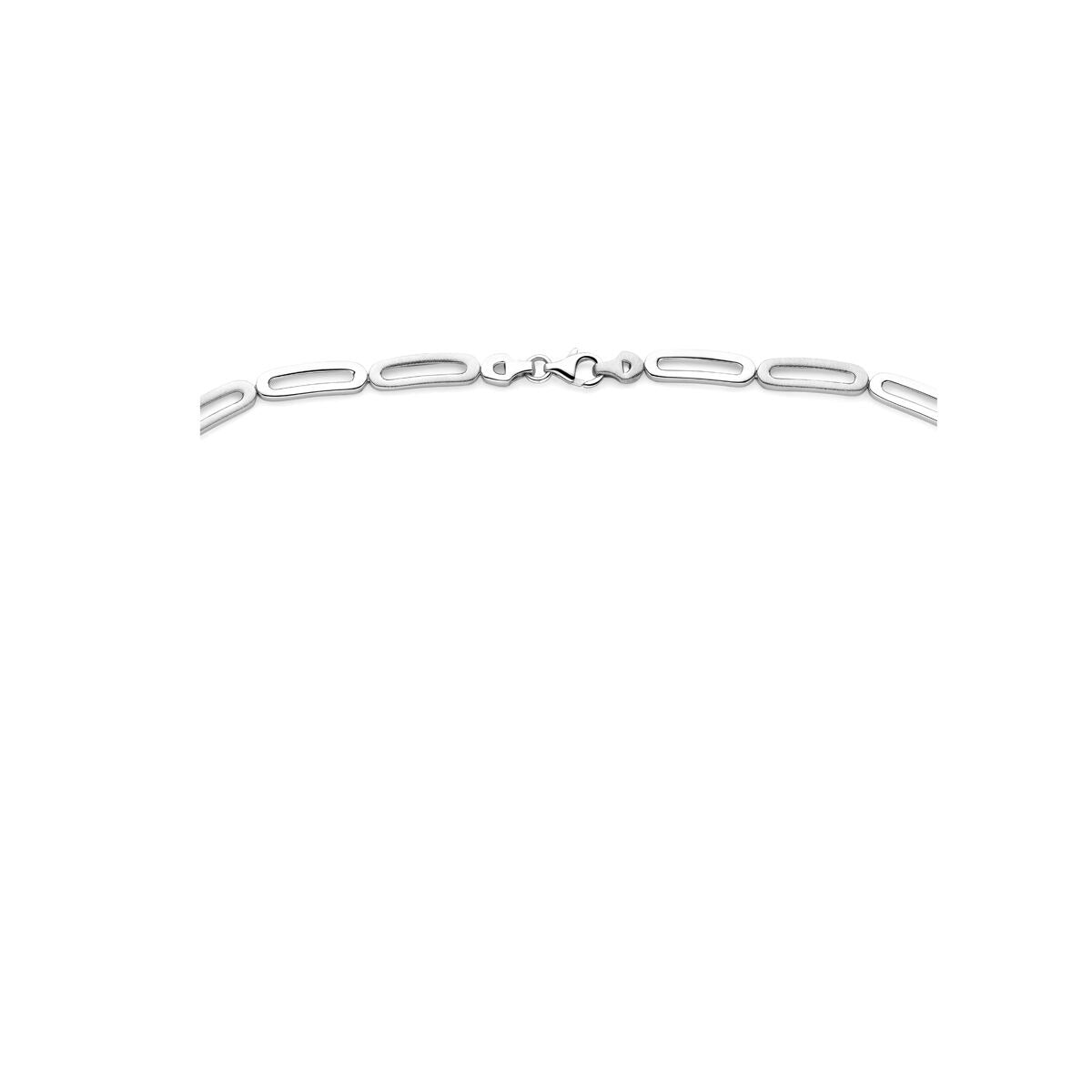Deze robuuste zilveren ketting zonder hanger is een krachtig sieraad met een moderne, stijlvolle uitstraling. Gemaakt van gerhodineerd 925 zilver en uitgevoerd met een opvallende schakeling van plaat-, buis- en spijltjesvormen, is dit collier een statement op zichzelf.
