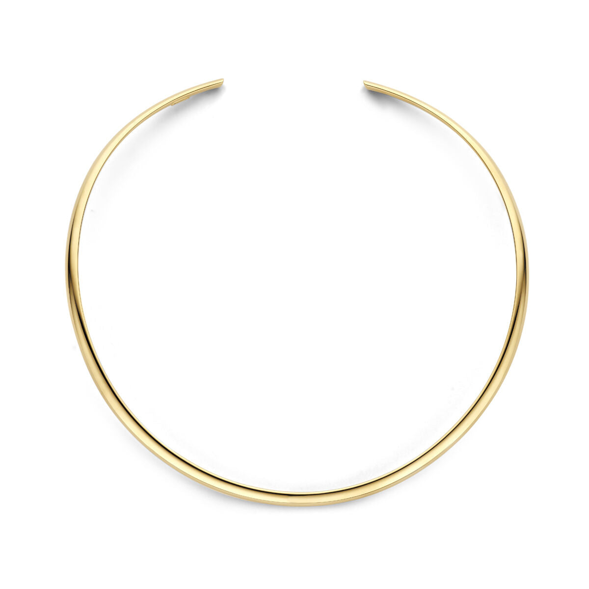 14k Geelgouden spang collier met ovale buis. De spang heeft een draaglengte van 41cm, een breedte van 25mm en een dikte van 5mm.
