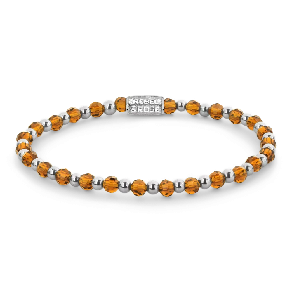 Deze verfijnde Rebel & Rose kralen armband is een subtiele eyecatcher met een warme, herfstachtige uitstraling. De combinatie van gepolijst hematiet en fonkelend glas rock in zilver- en bruintinten creëert een elegante mix van glans en diepte, perfect voor zowel een casual als chique look.