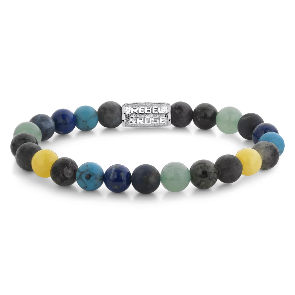 Bead armband, handgemaakt van 8mm stenen ( Larvakiet, Rholiet, Aventurien, Sodaliet, Lapis Lazuli, Turquoise, Jade) met een zilverkleurige sluiting. De Rebel & Rose sieraden zijn makkelijk te combineren met andere zilveren, leren of kralenarmbanden.
