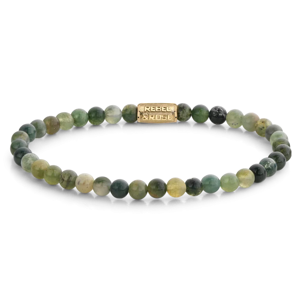 Bead armband, handgemaakt van 4mm Moss Agate stenen met een 18 karaat goud ion-plated edelstalen sluiting. Het Rebel & Rose sieraad is mooi te combineren met onze andere leren, zilveren of kralenarmbanden.
