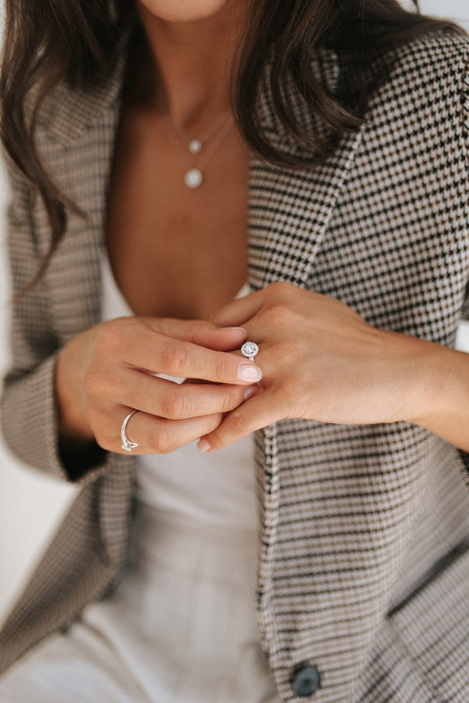 Dankzij haar stijlvolle en luxe uitstraling is ring Emma één van onze populairste ringmodellen. De ring heeft een schitterende entourage zetting. De ronde middensteen (briljant geslepen) wordt hierbij omringd door kleinere briljanten. De zijstenen in de scheen maken het plaatje van deze luxe ring compleet! De ring heeft een sierlijke verhoogde zetting, waardoor hij perfect gecombineerd kan worden met een gladde of diamanten rijring. Combineer haar bijvoorbeeld met de verfijnde Millie ring.