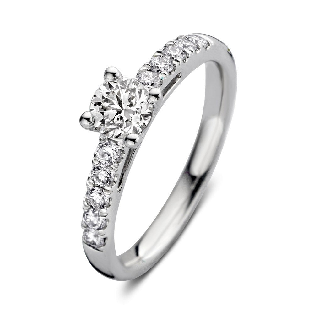 Ring Mary is een absoluut plaatje om te zien. Deze moderne klassieker bevat een prachtige briljant in vierpootszetting omgeven door fijnere briljanten in de scheen. Dankzij de open zetting vangt de diamant veel licht en schittert hij optimaal. Mary is prachtig te combineren met  een gladde of diamanten rijring. Probeer haar voor extra sparkle bijvoorbeeld eens samen met ring Millie.