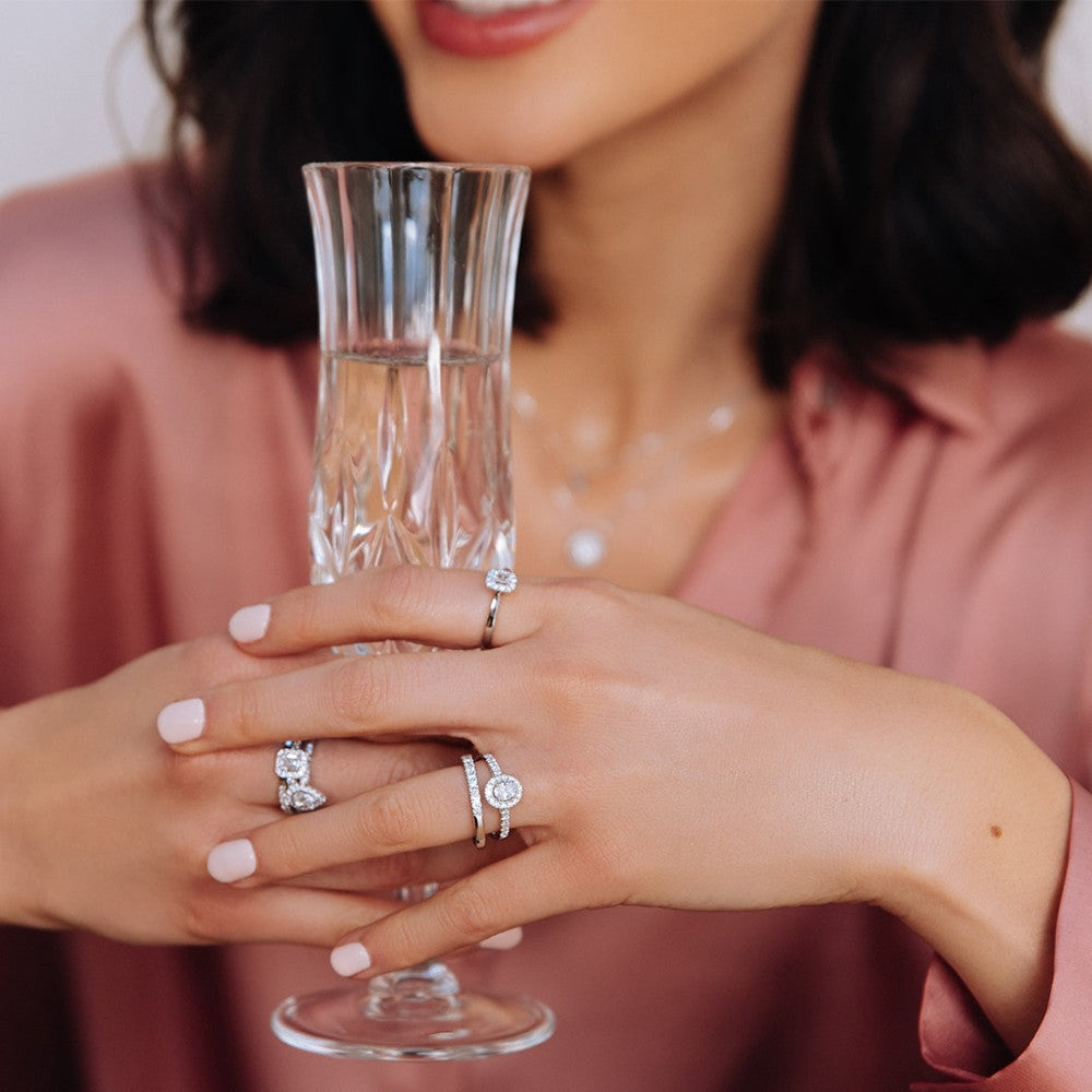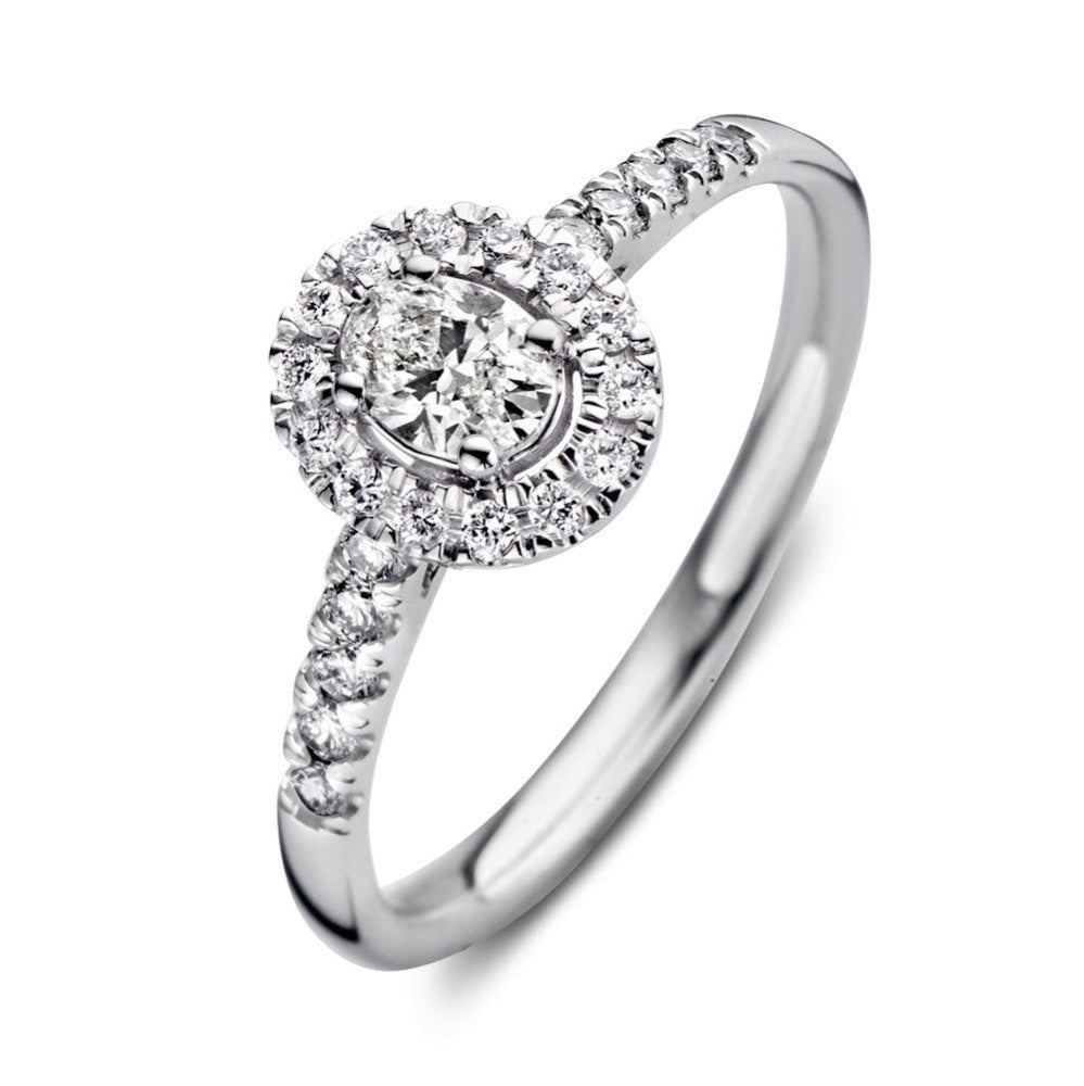 Rosie is een klassieker in een modern jasje. Deze ring bevat als stralend middenpunt een prachtige ovaal geslepen diamant. Rondom de ovale middensteen zijn kleinere briljanten gezet. De extra briljanten in de scheen van de ring maken en fonkelende plaatje compleet! Dankzij de verhoogde zetting is ring Rosie perfect met andere gladde of diamanten rijringen te combineren. Probeer haar eens met onze aanschuifring Millie.