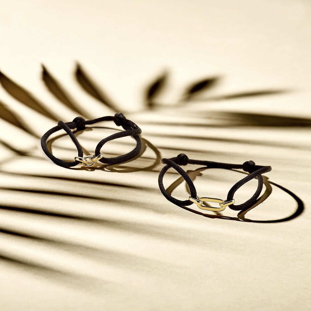 Minimalistisch met een luxe twist: deze zwart gevlochten armband is uitgevoerd met een verfijnde 14k geelgouden schakel van 6 mm, subtiel geïntegreerd in het ontwerp. De combinatie van het diepzwarte satijnen koord en het warme geelgoud zorgt voor een modern contrast dat zowel elegant als eigentijds oogt.