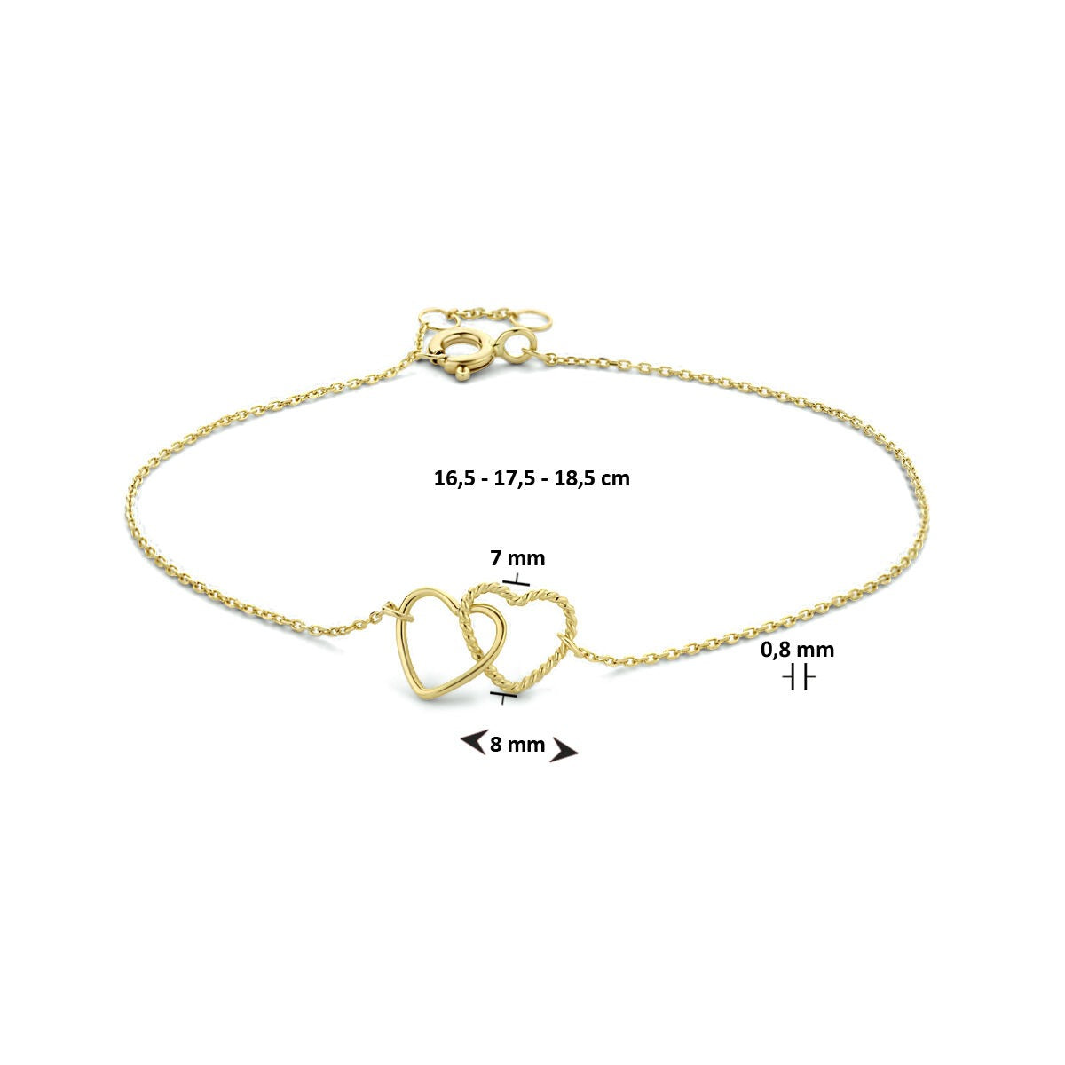 Dankzij de verstelbare draaglengtes van 16,5 tot 18,5 cm sluit de armband comfortabel aan om de pols. De veerringsluiting zorgt voor een veilige en prettige draagervaring. Het warme 9 karaat geelgoud benadrukt de zachte vormen van de hartjes en maakt deze gouden dames armband tot een tijdloos cadeau, bijvoorbeeld voor Valentijn of een andere bijzondere gelegenheid.