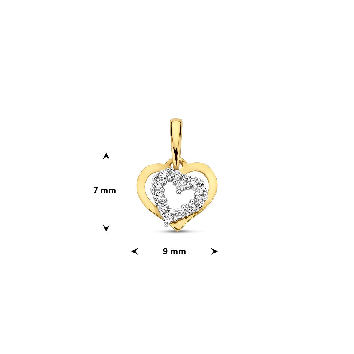 Deze 9k bicolor hanger met hart en zirkonia is een verfijnde samensmelting van warme en lichte tinten goud. Het hartje, met een afmeting van 7 x 9 mm, is uitgevoerd in een elegante combinatie van geel- en witkleurig goud, waardoor een subtiel contrast ontstaat dat direct in het oog springt. De briljant geslepen, transparante zirkonia’s zijn in een verfijnde rijzetting geplaatst en omlijsten het hart met een sprankelende schittering.