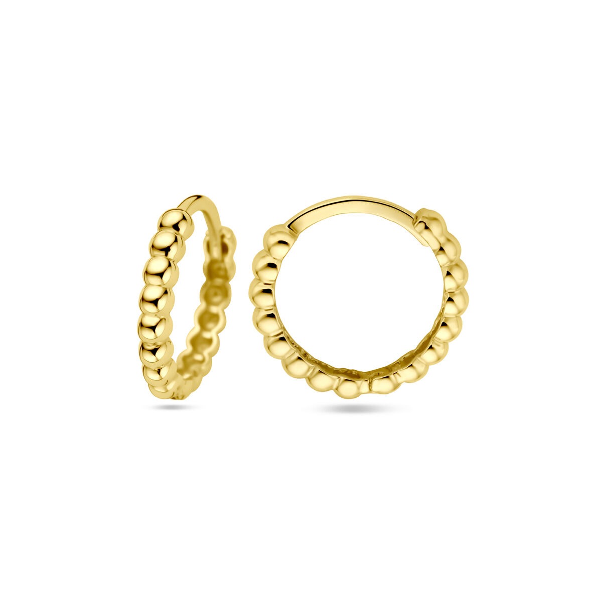 Deze 9k geelgouden klapoorringen met bolletjes zijn een speelse en verfijnde interpretatie van klassieke Gouden Creolen. Met een afmeting van 13,5 x 2 mm hebben de oorringen een elegant, slank profiel dat mooi om het oor valt. De subtiele bol- en halfbolstructuur geeft het ontwerp een levendig karakter en zorgt voor een zachte lichtreflectie bij iedere beweging.