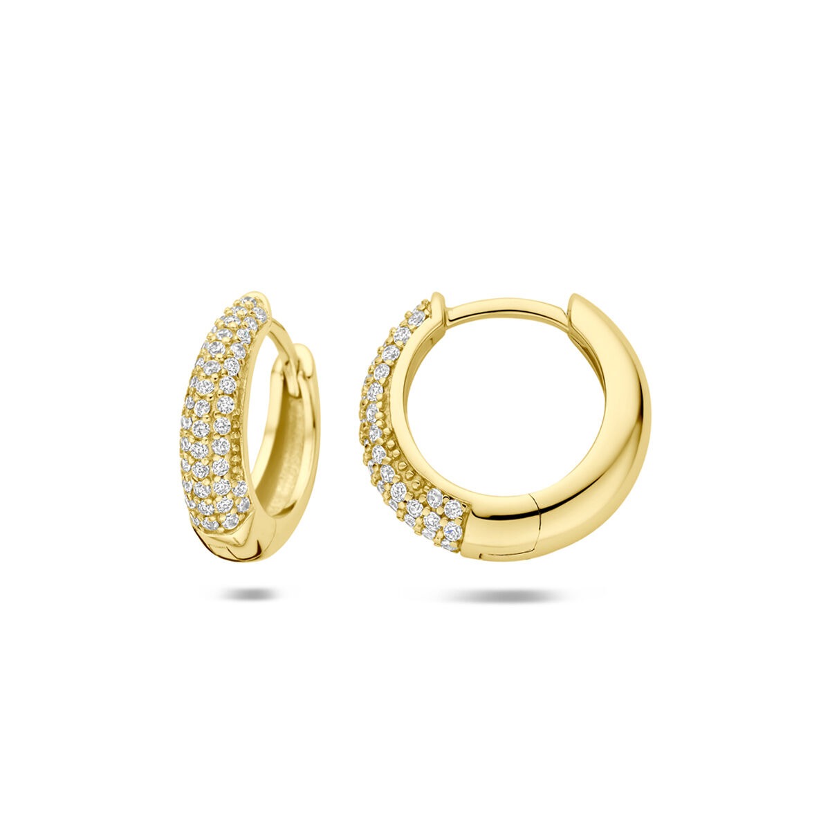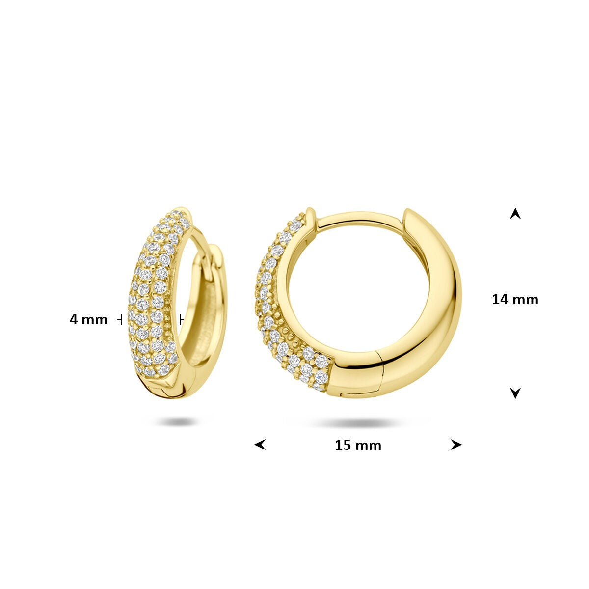 Deze verfijnde verguld 925 zilveren oorringen combineren klassieke vormgeving met een sprankelend detail. De oorringen zijn uitgevoerd in geel verguld zilver en bezet met transparante zirkonia in een briljante slijpvorm. De stenen zijn zorgvuldig in pavé rijzetting geplaatst, waardoor een subtiele maar opvallende schittering ontstaat bij iedere beweging. Met een hoogte van circa 14 mm en een buisdikte van 4 mm hebben deze gouden oorringen een elegante, moderne uitstraling die perfect past bij zowel alledaagse outfits als feestelijke gelegenheden. De praktische scharniersluiting zorgt voor comfortabel en veilig dragen.