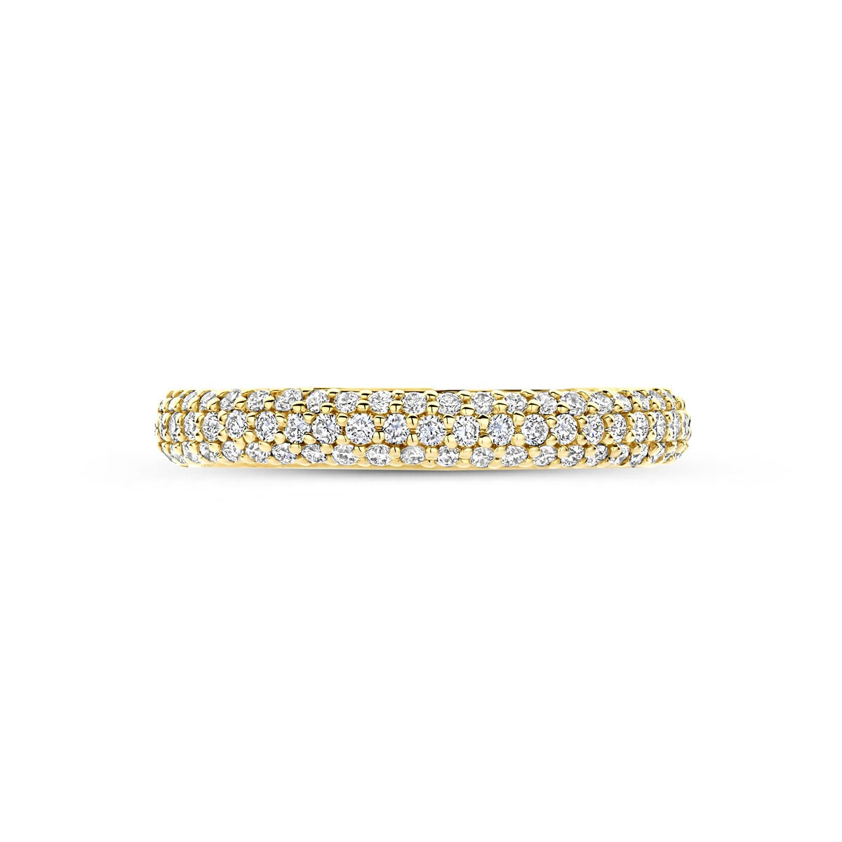 Deze 14k geelgouden ring met lab grown diamanten is een verfijnde en sprankelende keuze binnen onze collectie gouden ringen met diamant. De briljant geslepen diamanten zijn in een elegante rijzetting geplaatst, waardoor een doorlopende schittering ontstaat over de bovenzijde van de ring. Met een totale diamantgewicht van 0,48 karaat en een zuiverheid van VS2 straalt iedere steen helderheid en klasse uit.