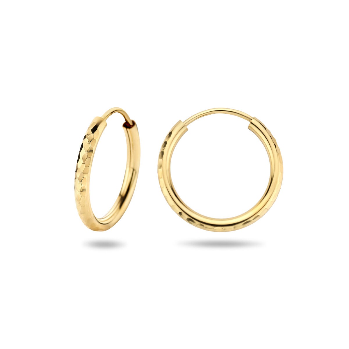 Deze 14 karaat geelgouden oorringen combineren klassieke vorm met een verfijnde afwerking. De ronde buisvorm is subtiel gediamanteerd, waardoor het oppervlak op elegante wijze het licht vangt en een sprankelend effect geeft. Een stijlvol detail dat deze oorringen net dat beetje extra geeft.