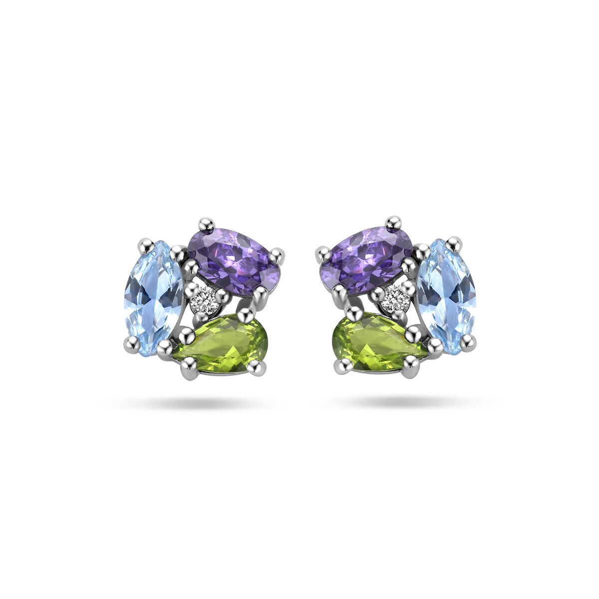 Gerhodineerd 925 zilveren oorknoppen uitgevoerd met vier stenen: zirkonia, zirkonia amethist, synthetisch blauw spinel en synthetisch peridot. De oorknoppen hebben een afmeting van 8x8mm.