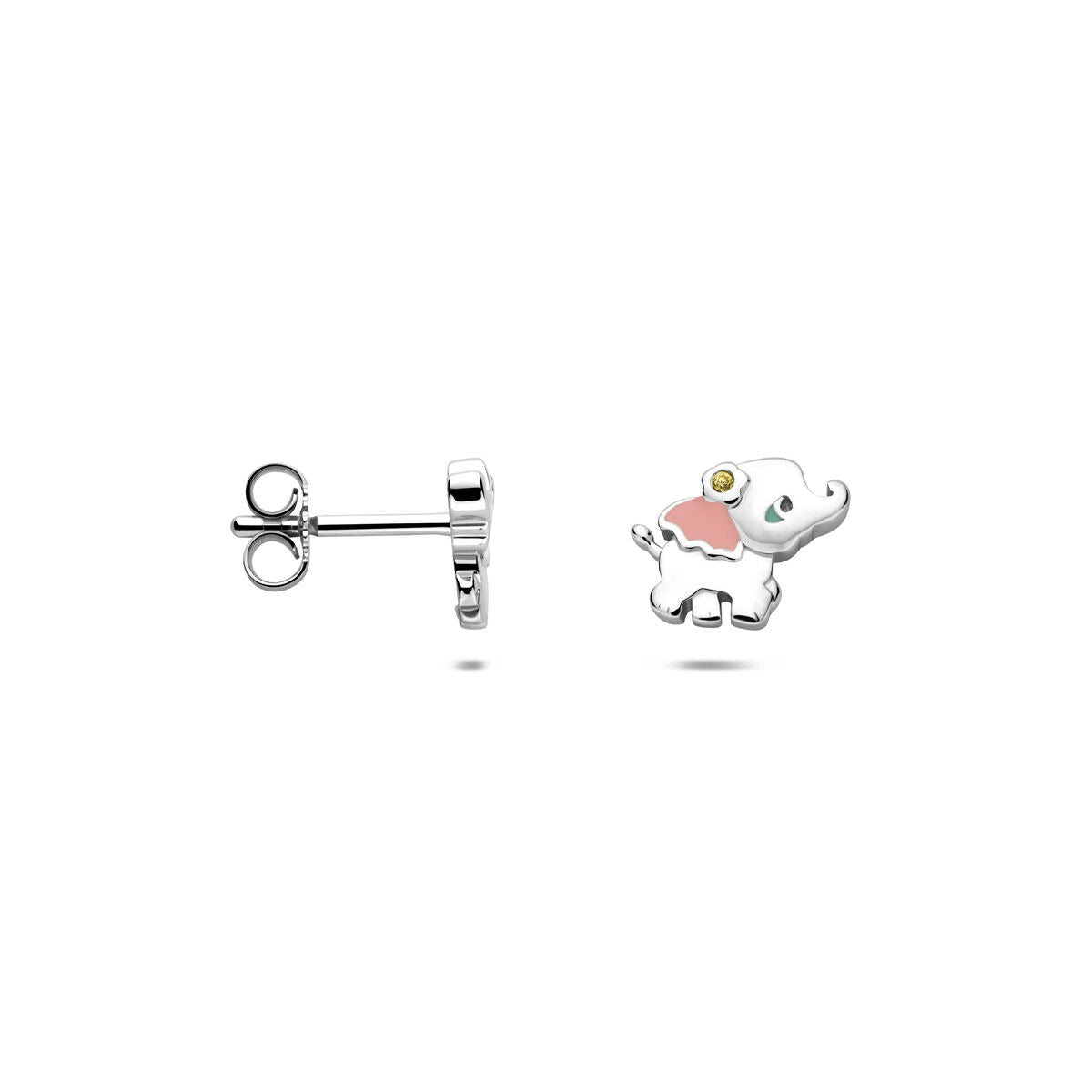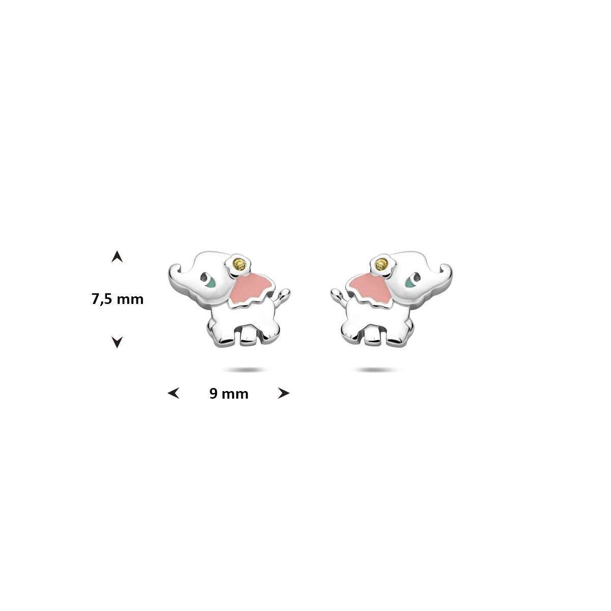 Deze schattige gerhodineerd 925 zilveren oorknoppen in de vorm van een olifantje zijn een vrolijke toevoeging aan elke kindercollectie. Met een afmeting van 9 x 7,5 mm zijn ze perfect in verhouding voor kleine oortjes. De oorknoppen zijn speels versierd met zachte tinten geel, roze en wit emaille, en een fonkelende transparante zirkonia zorgt voor een extra sprankelend detail.