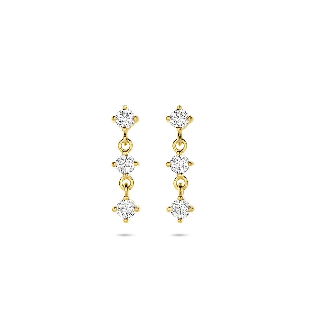 Deze elegante oorhangers van verguld op 925 zilver zijn een subtiele blikvanger voor elke gelegenheid. Centraal schittert een transparante zirkonia met een diameter van 3 mm, briljant gezet in een klassieke entourage-vorm en stevig gefixeerd met een chatonzetting met vier pootjes. De warme goudkleurige afwerking geeft de oorhangers een luxe uitstraling, terwijl de totale lengte van 16 mm zorgt voor een verfijnd en vrouwelijk silhouet.