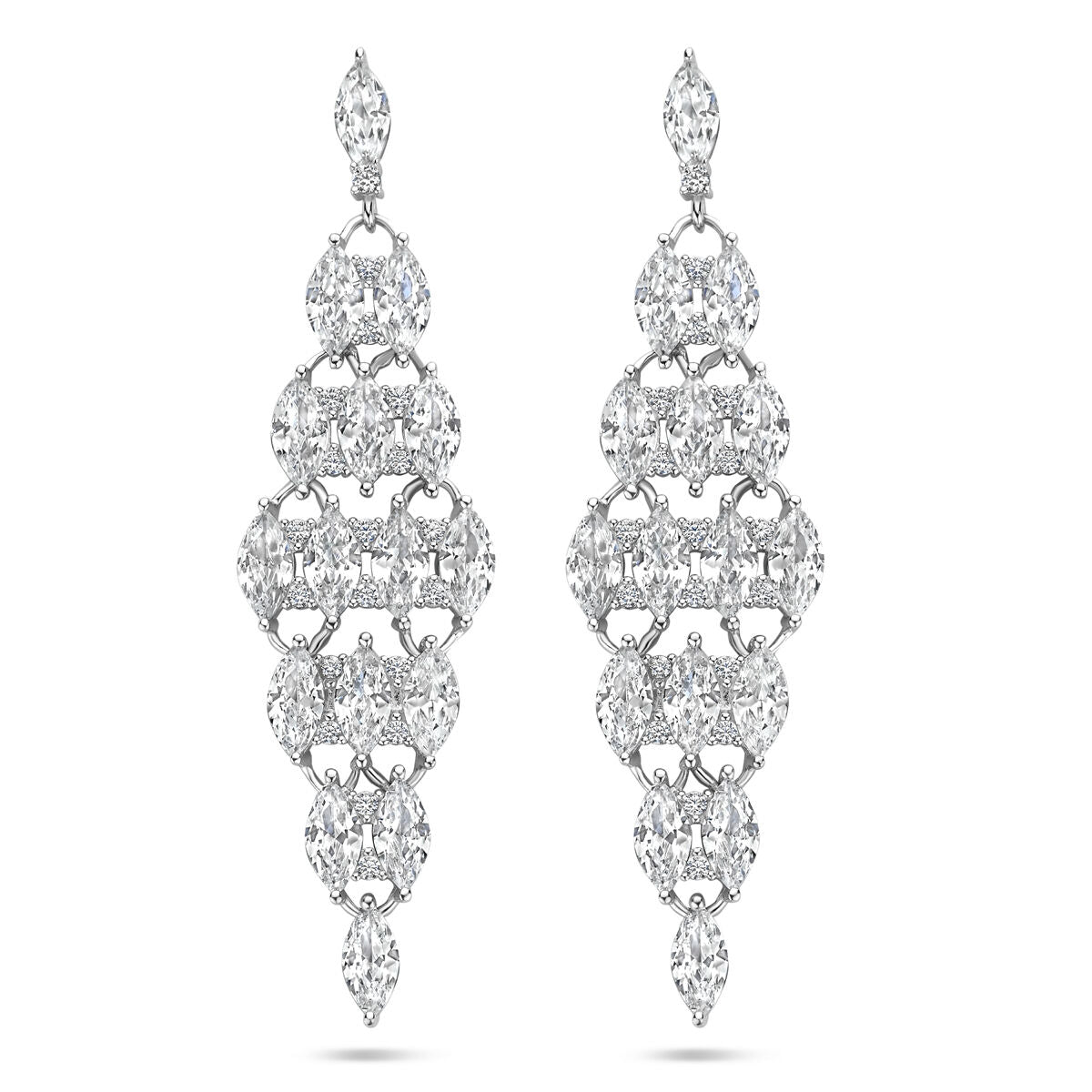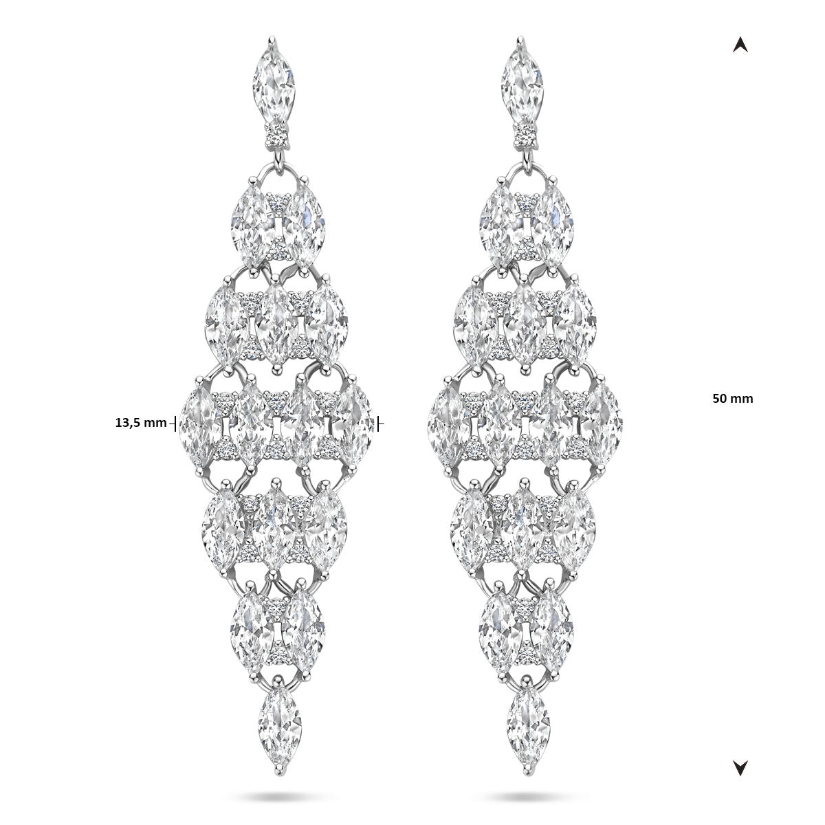 Gerhodineerd 925 zilveren oorhangers uitgevoerd met zirkonia. De oorhangers hebben een lengte van 50mm en een breedte van 13.5mm.