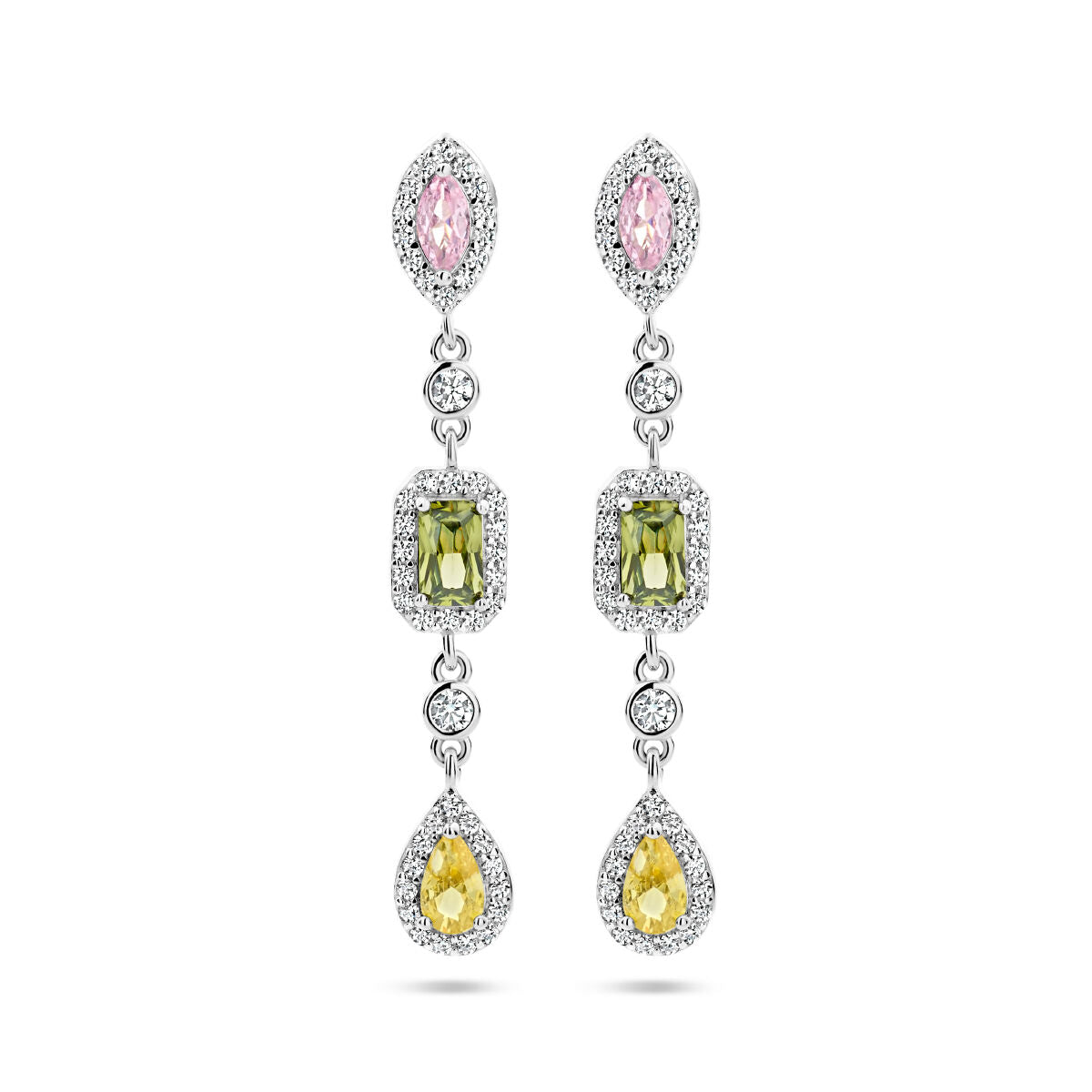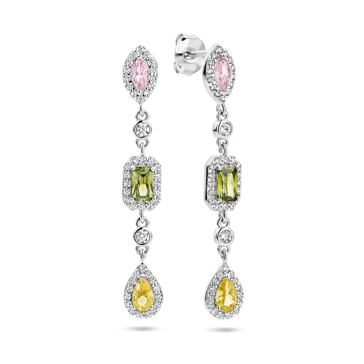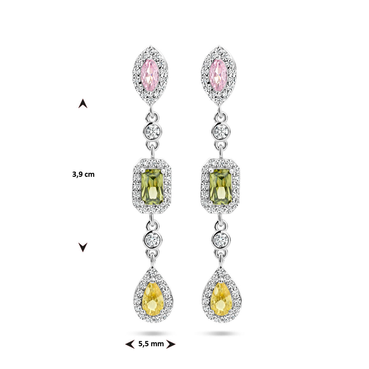 Gerhodineerd zilveren oorhangers uitgevoerd met schitterende zirkonia in de kleuren: wit, geel, roze en groen. De oorhangers hebben een totale hoogte van 39mm.