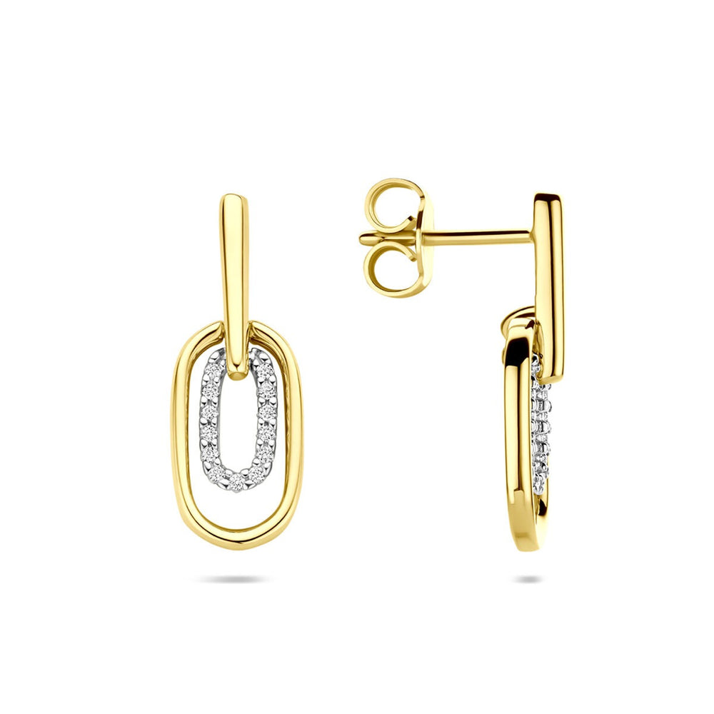 14k Bicolor oorhangers met diamant – geel- en witgoud, 0.08 ct, 20 mm hoog