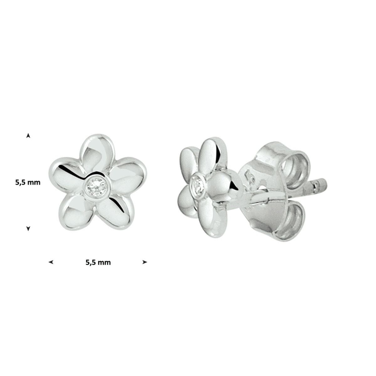In het hart van elk bloemetje schittert een transparante, briljant geslepen zirkonia die fonkelt bij elke beweging. De oorknopjes hebben een subtiele afmeting van 5,5 mm en sluiten veilig met een comfortabele poussette, ideaal voor kinderoren.